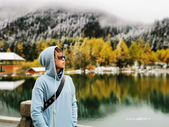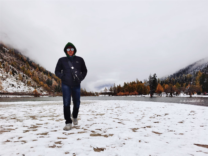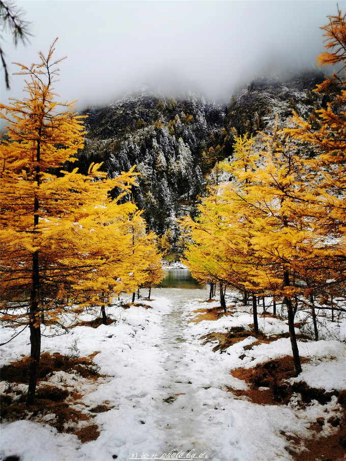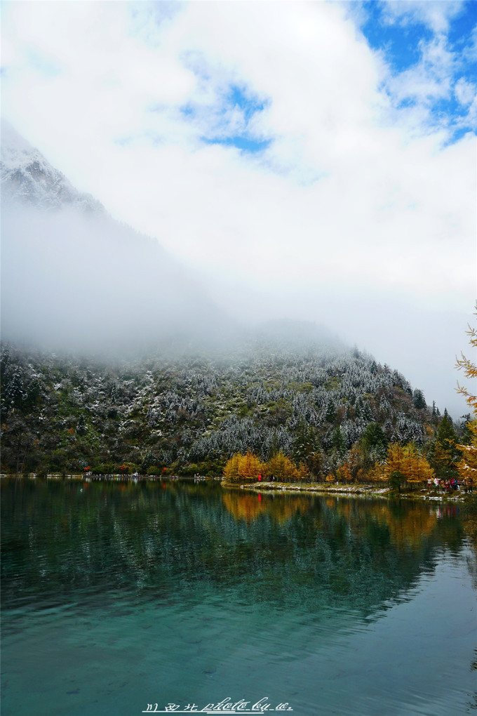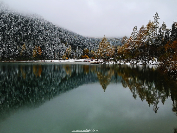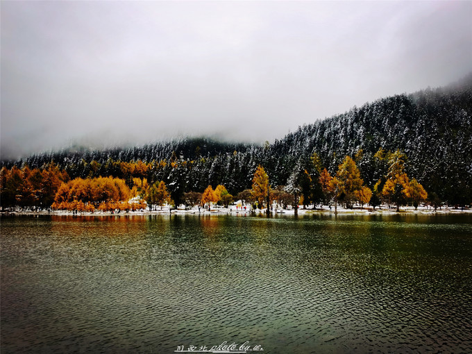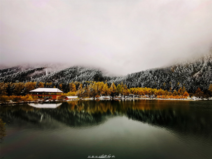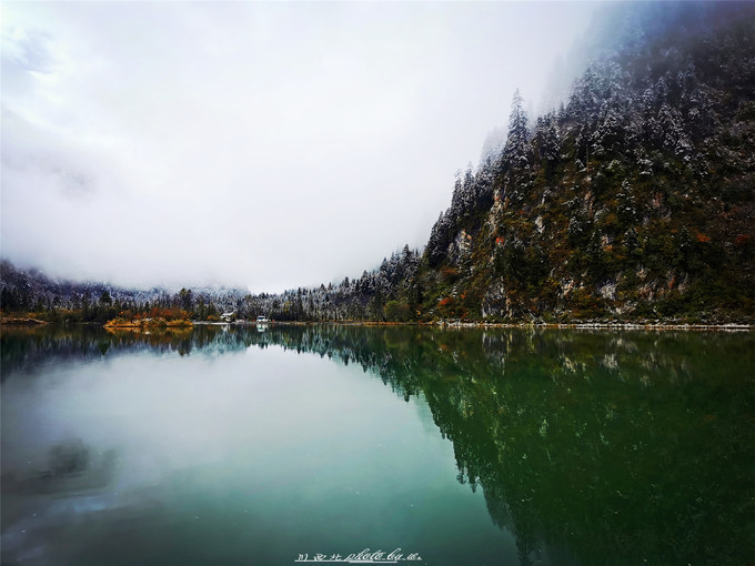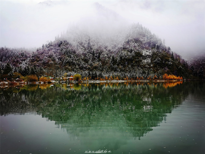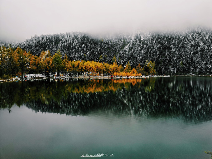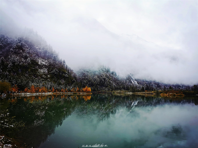 说磐羊湖是毕棚沟最美的地方一点都不为过,雪山、森林笼罩在乳白色的云烟中,影影绰绰,半山秋色半山雪,美轮美奂。