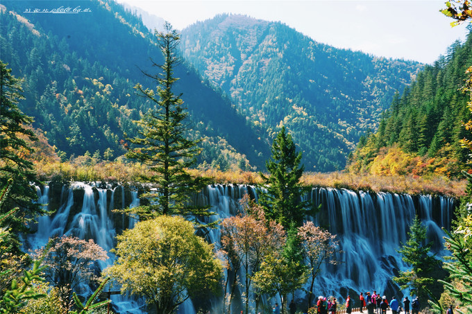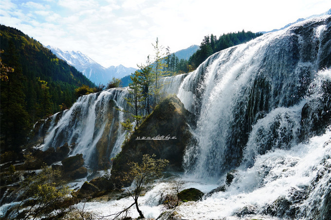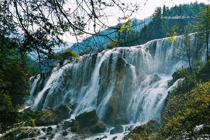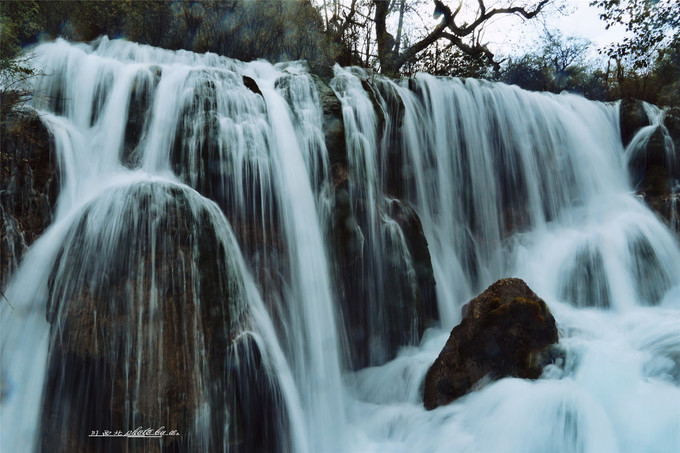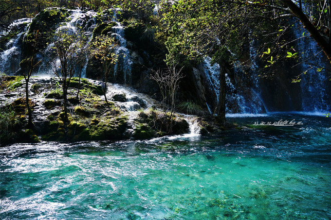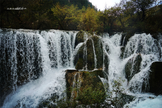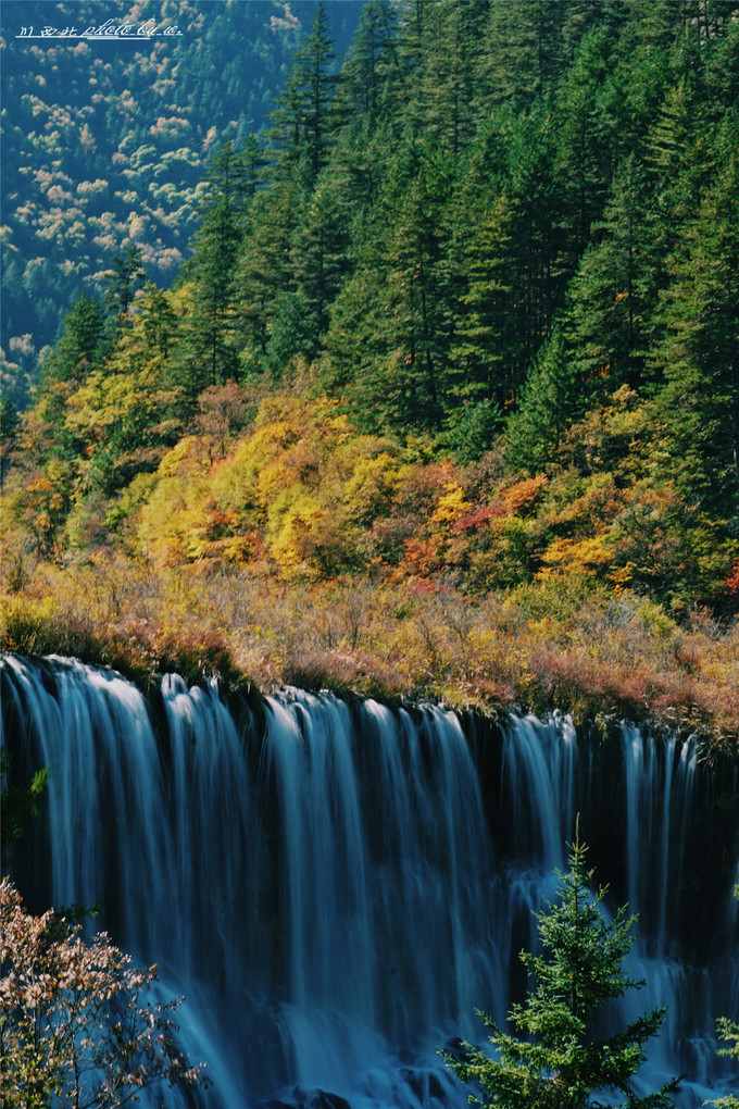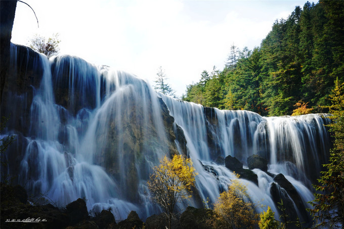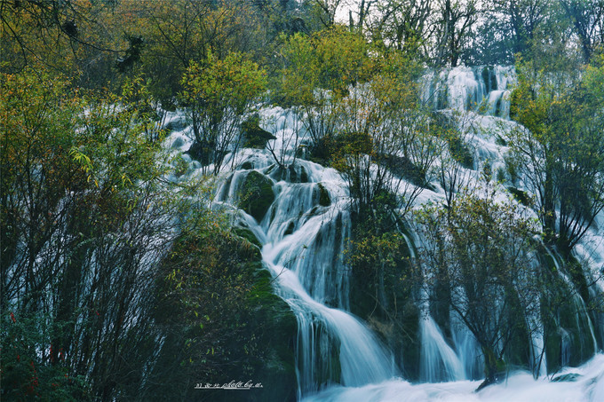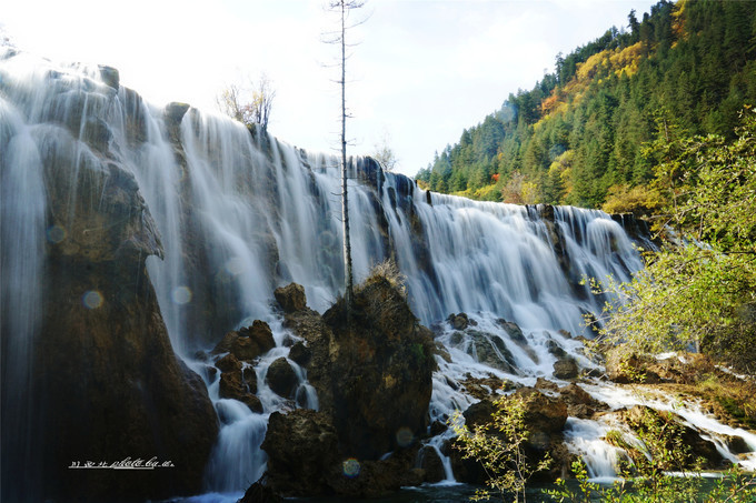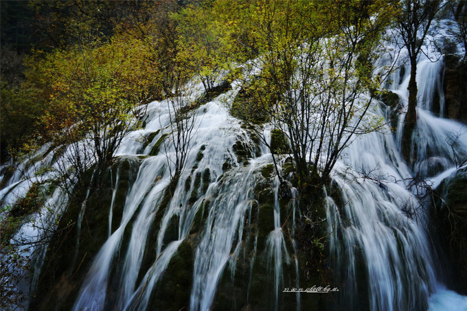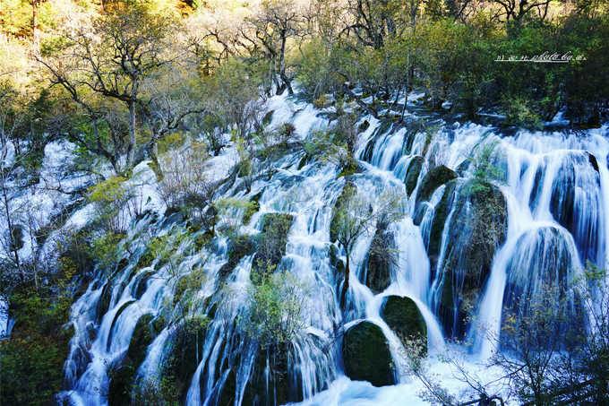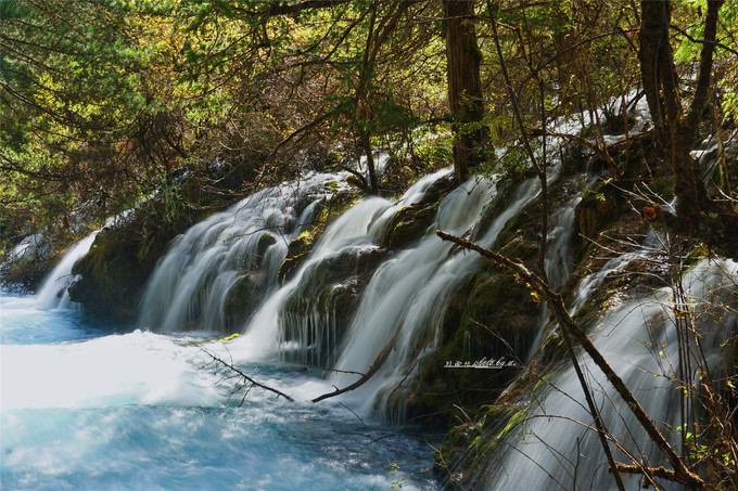 树正瀑布是九寨沟里的叠瀑代表,上游的湖水沿着浅滩四处漫流,在树丛中穿行,形成一道道宽坦或狭窄的瀑布,演绎着“树在 水里 长,水在林中流”的奇观。