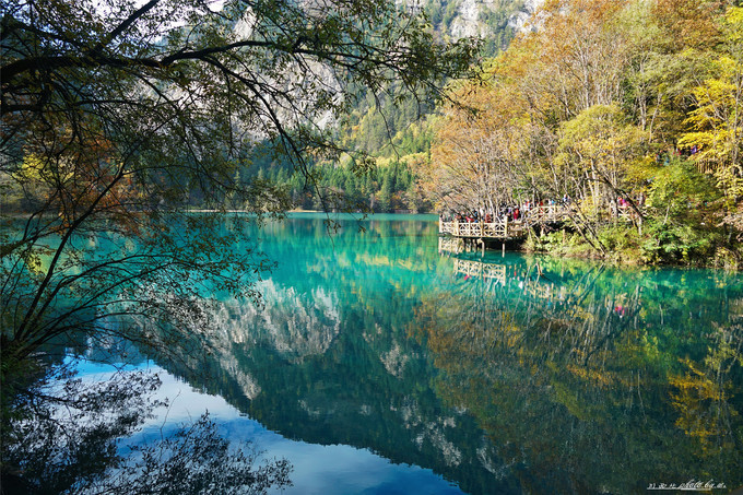 没到过五花海,你永远都不会知道九寨有多美!含碳酸钙质的池水,与含不同叶绿素的水生群落,在阳光作用下,幻化出缤纷色彩,一团团、一块块,有湛蓝、有墨绿、有翠黄。岸上丛林,赤橙黄绿倒映池中,一片色彩斑斓。