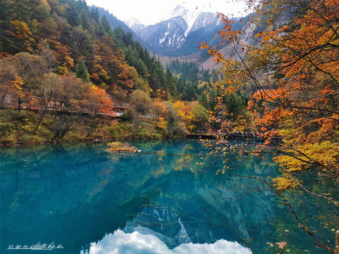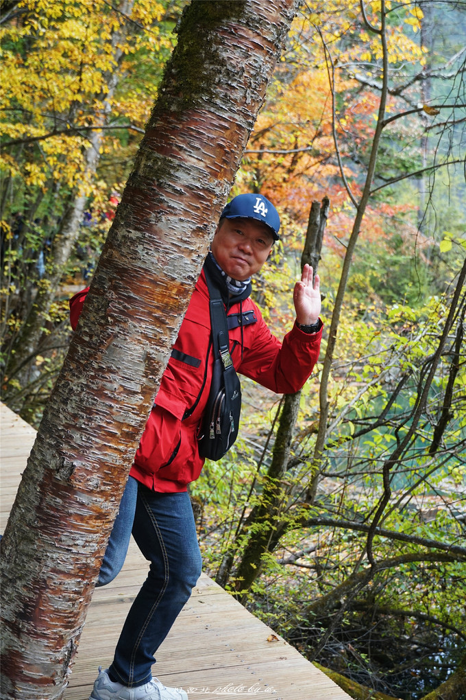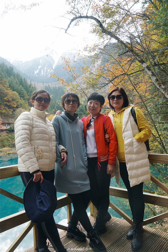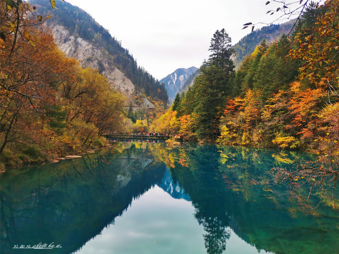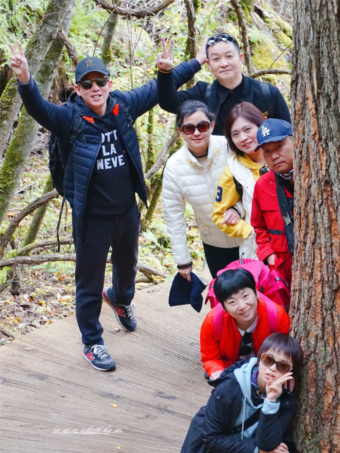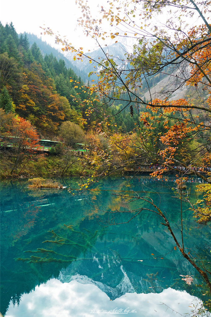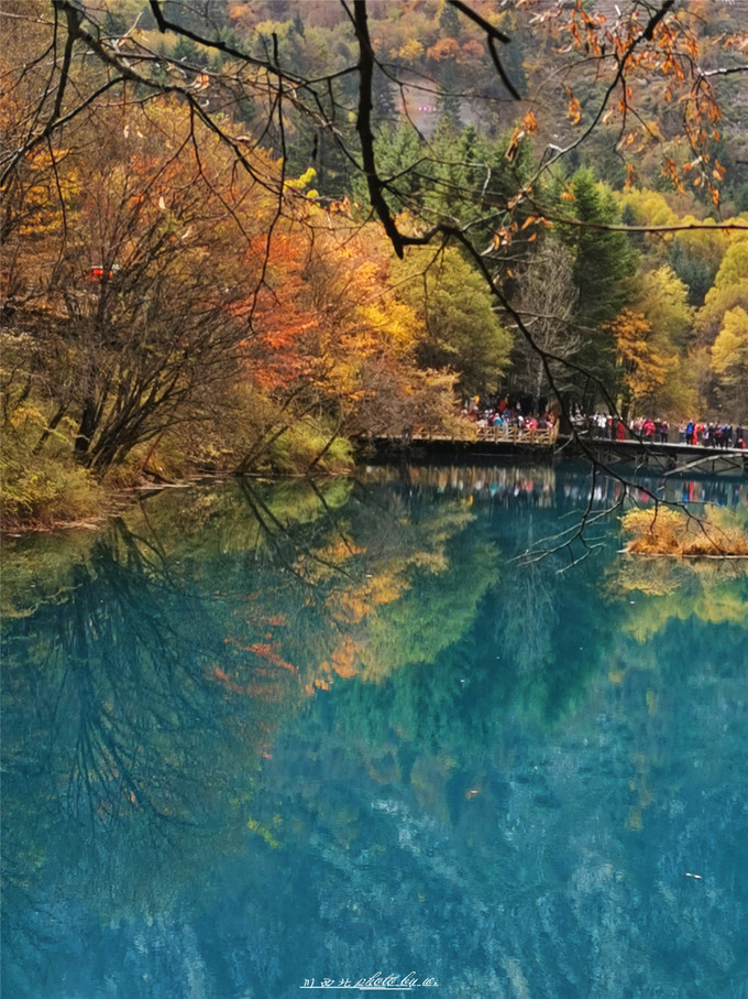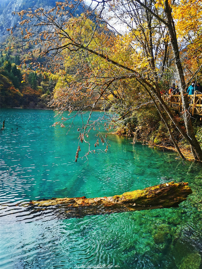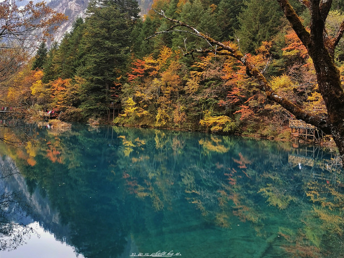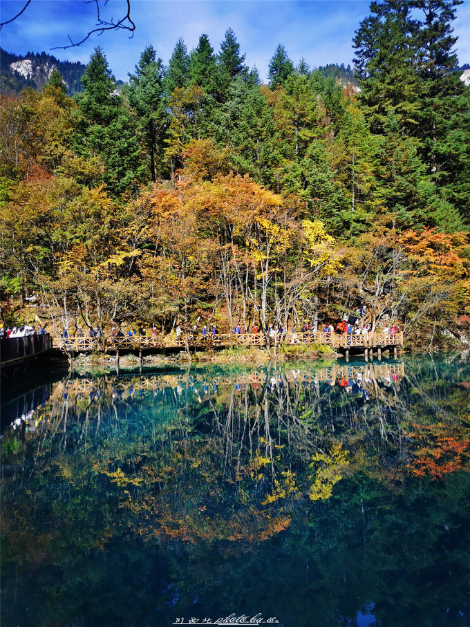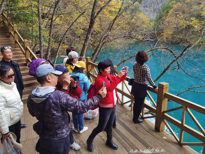 十月下旬是九寨沟最美的时候,不乏摄影爱好者及扎堆的旅行团,我们预定的八点半入园,景区门口那长龙似的队伍差点没把我们吓死。人一多就乱了方寸,也没看清班车的区分,来一辆空车,人群便一拥而上,我们被人群包裹着上了一辆,结果到了树正寨就全部赶下了车,由栈道步行800米到前方的站点上车。那一车车拉上来的游客在狭窄的栈道上根本无法疏通,以极慢的迅速蠕动着,这也为后来错过镜海最美的样子埋下了伏笔。