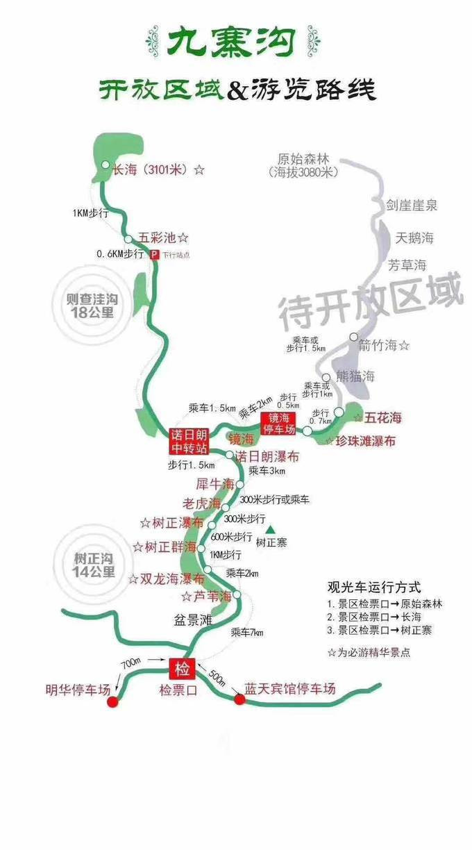 3、网上关于沟内的玩法有很多,简单说一下,游览路线呈Y型,主干为树正沟,左上角为则查洼沟(长海方向),右上角为日则沟(原始森林方向,目前只开放到五花海,五花海至原始森林段因地震破坏暂不开放)。
