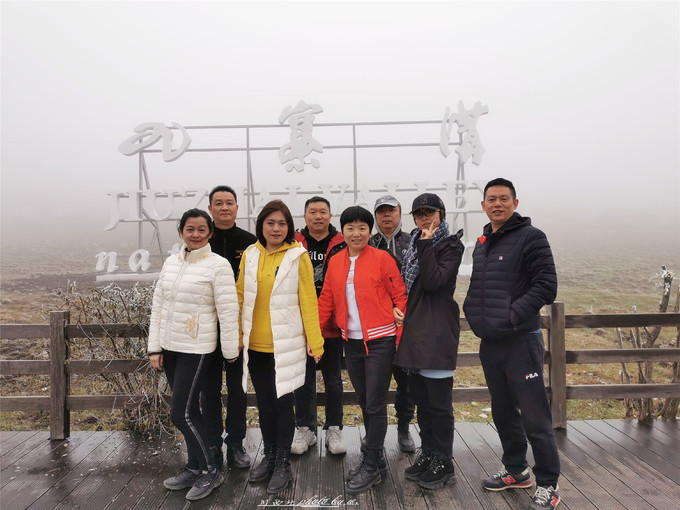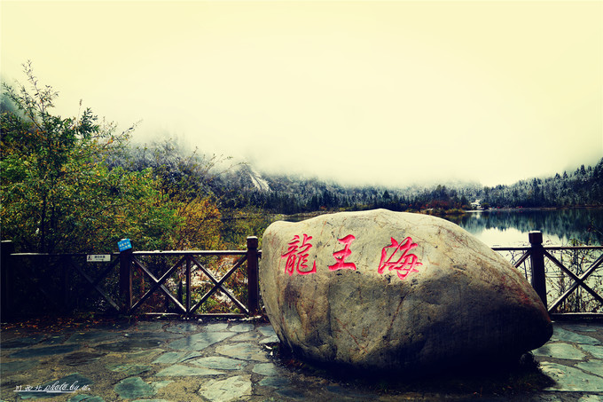 龙王海是景区观光车到达的第一个停车点,一个翡翠般的高山湖泊,湖水像一面巨大的镜子镶嵌在四面围拢的群山间,厚厚的云雾笼罩着天空,弥漫在山腰,本应是五彩的群山由于光线暗淡没有显得跃然欢快而像沉睡未醒,群山倒映在似镜的湖面显得十分宁静。