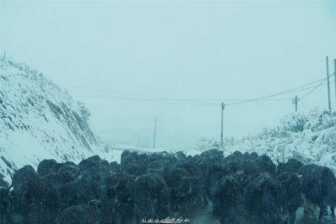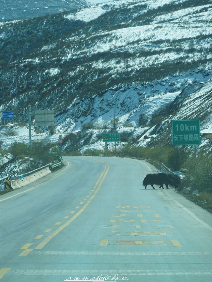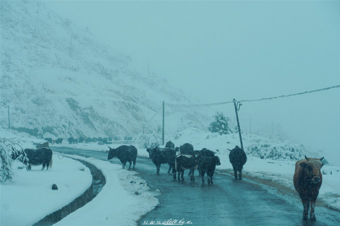 雪水浸湿让本来就在养护的S302充满泥泞,我们在颠簸中缓慢前行。一群顶着风雪的牦牛挡住了去路,我们跟在后面动弹不得,不敢摁喇叭,怕惊了,不敢冲过去,怕撞了,这群行走的人民币着实让我们不知所措。好在进雅克夏雪山隧道前这群“拦路虎”走小路上山了,不然还不知道要在风雪中等候多久。