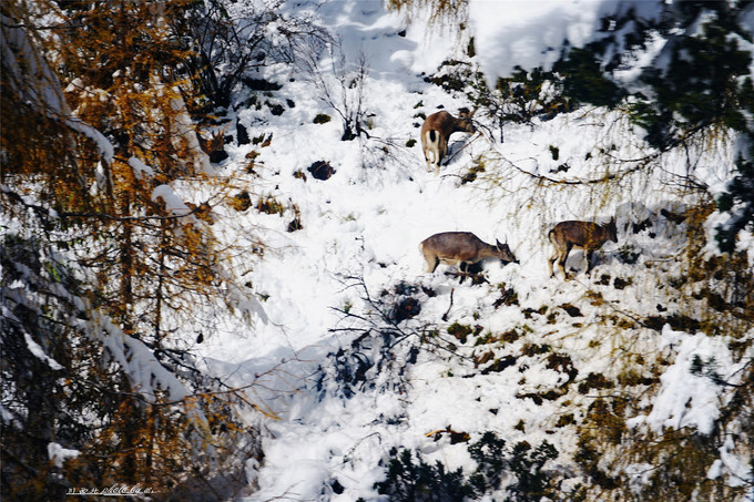突然就看到了在雪地里撒欢的岩羊,这里或许是它们的乐园,没有杀害,没有天敌。