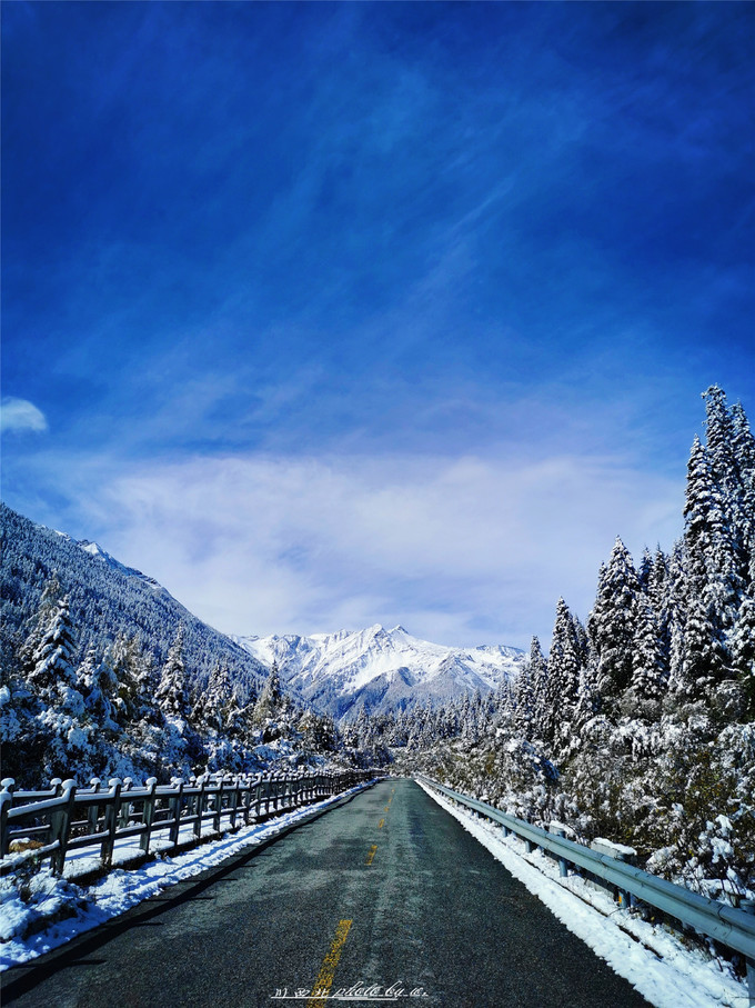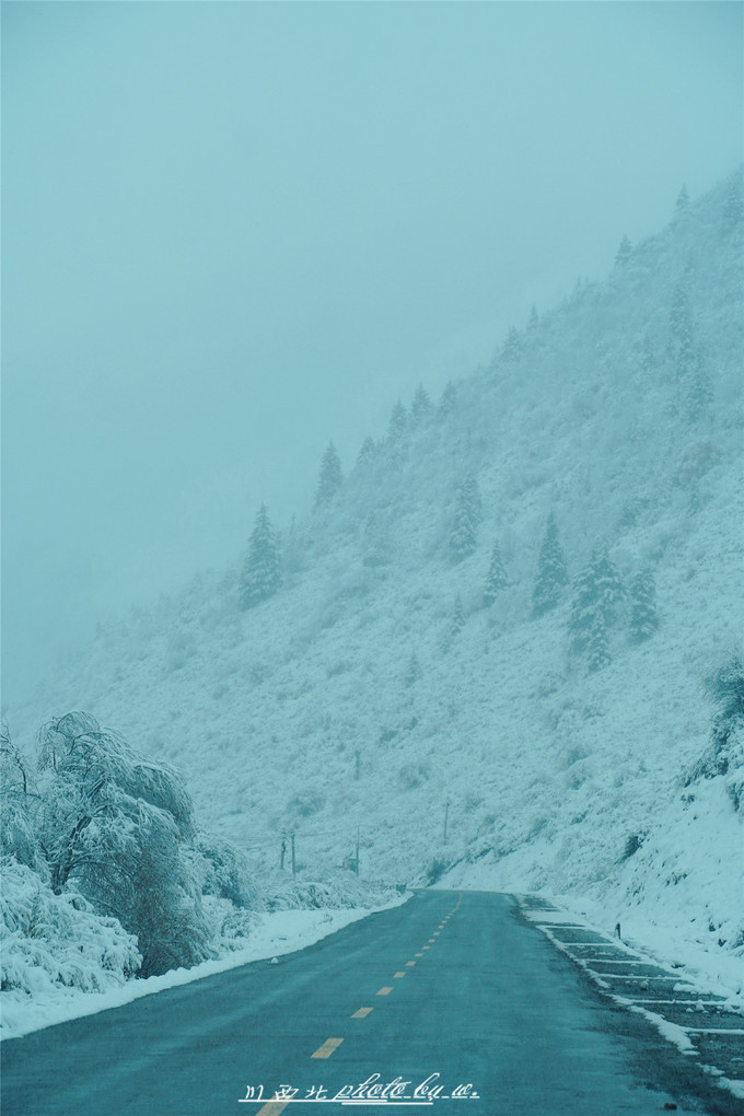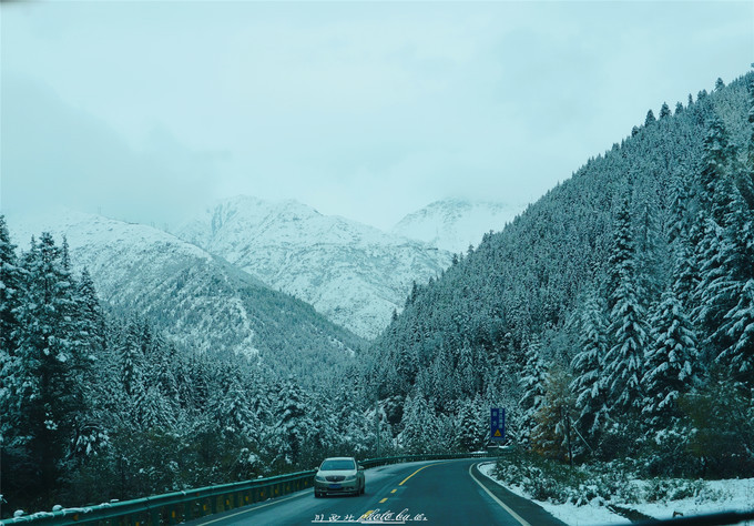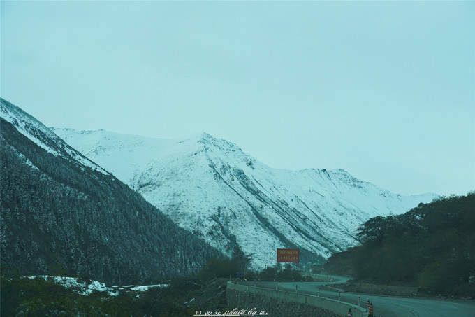 米亚罗镇似乎就是秋与冬的交界线,过了村镇,就进入鹧鸪山了,也逐渐进入雪的世界,沿着杂谷脑河在山谷间曲折前行,两侧山峰白雪覆盖,时而挺拔,时而突兀。