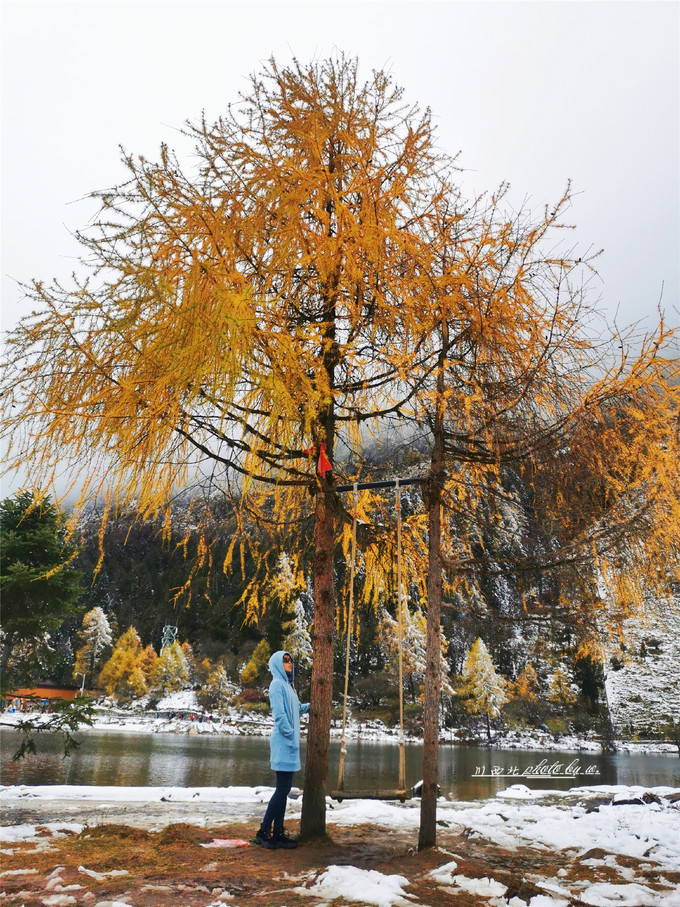 在明黄色的针叶林中穿行,然后坐在湖边的秋千上,静静望着这山、这水、这林,享受这撩人秋色。