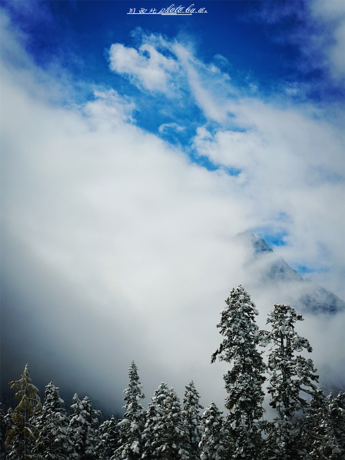 到达观光车终点上海子时,蓝色的天空在一团散开的雾气中渐渐露了出来,远处的雪山一点点探出头,阳光下泛着羞涩,一会儿功夫浓雾再次弥漫开来,还没看清真容,又沉入新的迷蒙之中。