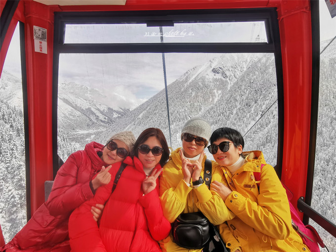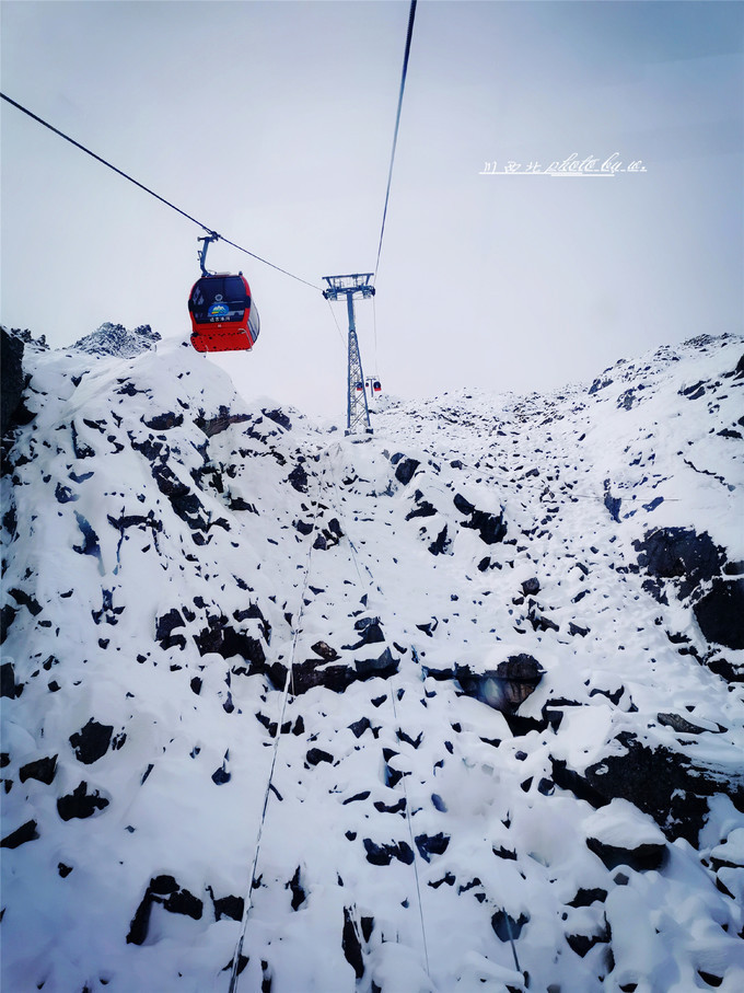 在凌云索道站乘坐世界 上海 拔最高的索道,穿行在几千米的高空,红色的缆车在雪山背景下缓缓而来,一直向上,眼前风景从白雪覆盖的密林到稀疏的灌木,再到目所能及之处难见任何植被,连心跳都听得真切。
