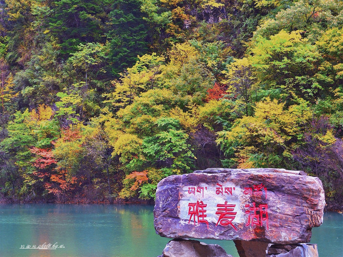 雅麦湖,一个路边免费景点,雅克夏雪山上的冰雪融化,带着大量矿物质顺着峡谷流到这儿,积成一个泛着蓝光的水潭,山崖上彩林倒映在水中,幻化出另一个多彩的世界。