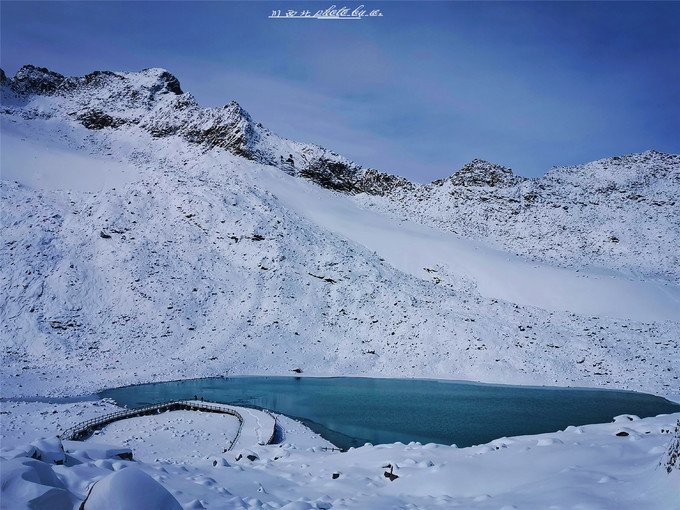越过一道山脊,不知名的海子静静的躺在冰川之中,如翡翠般透亮。