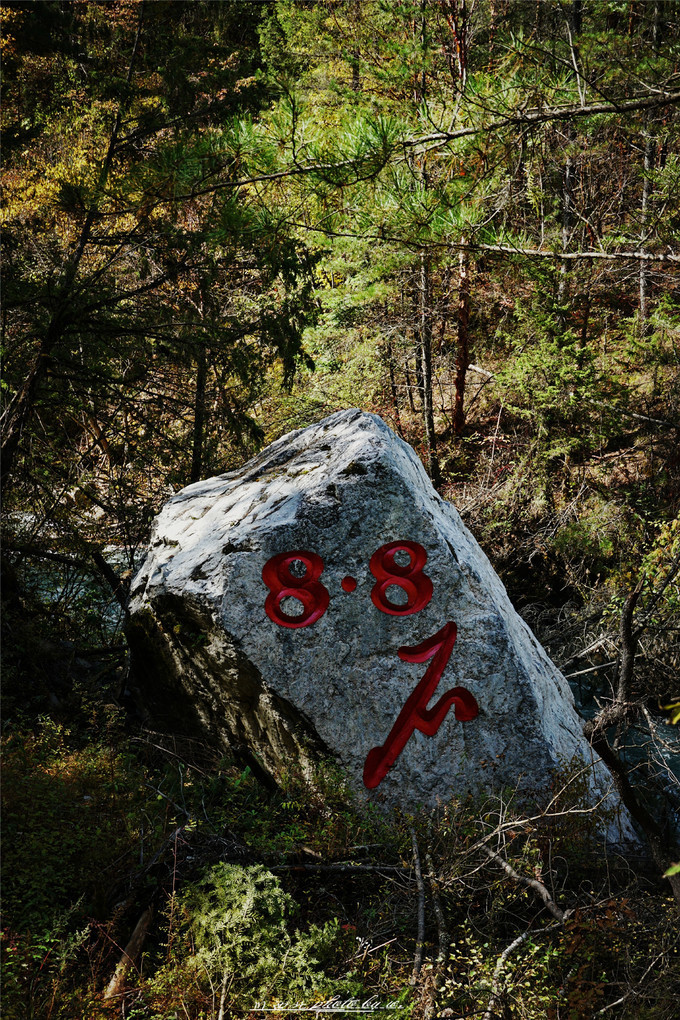 路过九寨沟震后被显赫的红色标志出来的“8.8”石,地震时它从几百米的山顶飞滚而下,它的存在也印证了那场地震对这个世界级景区的巨大影响。