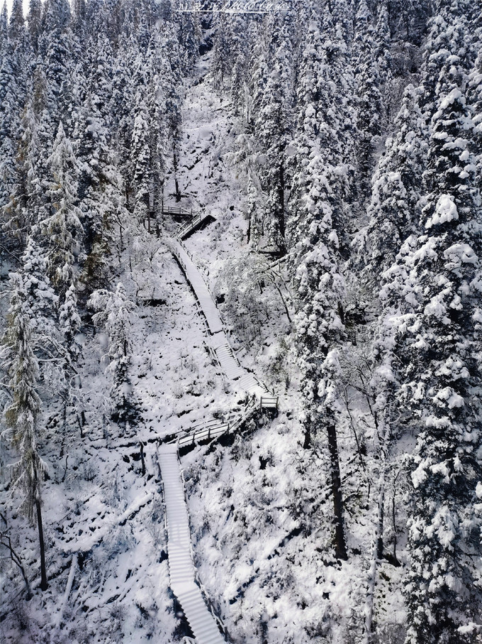 弯延曲折的林间栈道在雪地里看上去很美,要想爬上山顶,先得问问自己砰嗵砰嗵的小心脏同不同意。