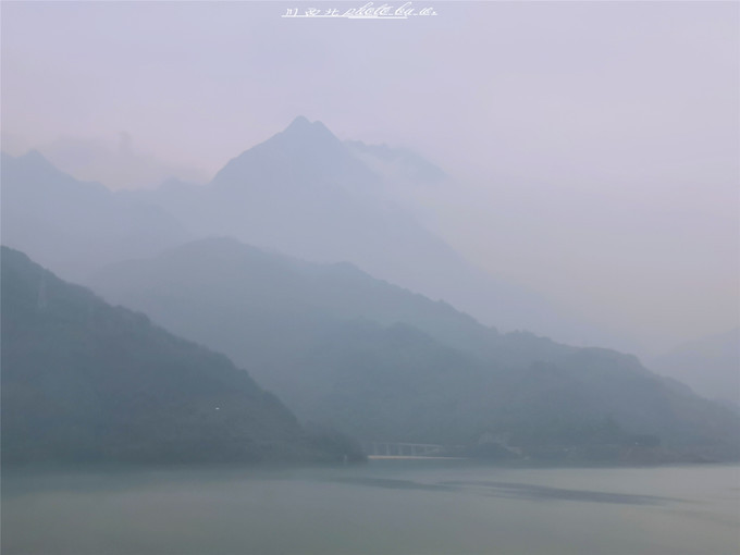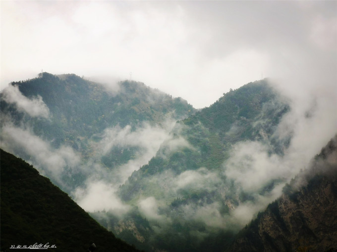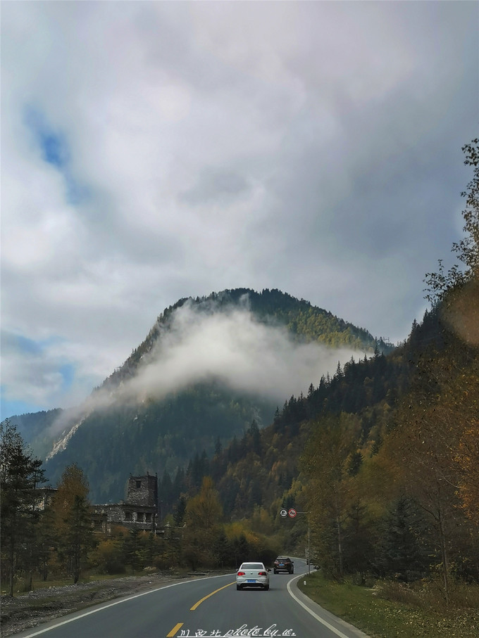 从理县县城到毕棚沟景区还有半小时车程,远处的山在雾中如仙气缭绕。
