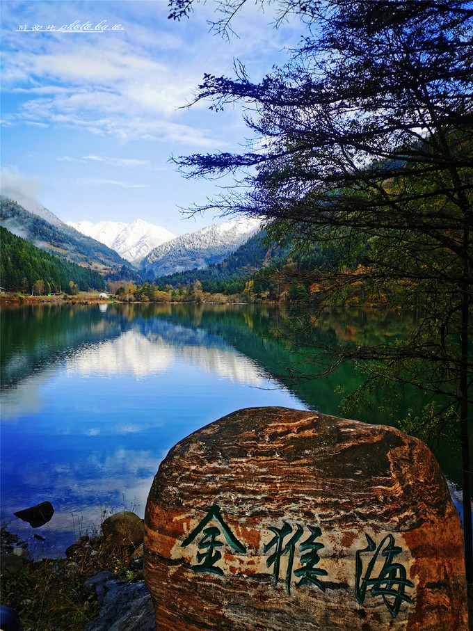 进入达古冰川,观光车停靠的第一个站点便是金猴海。澄澈的湖水和蔚蓝的天空相衬,将山色揽入怀中,美不胜收。