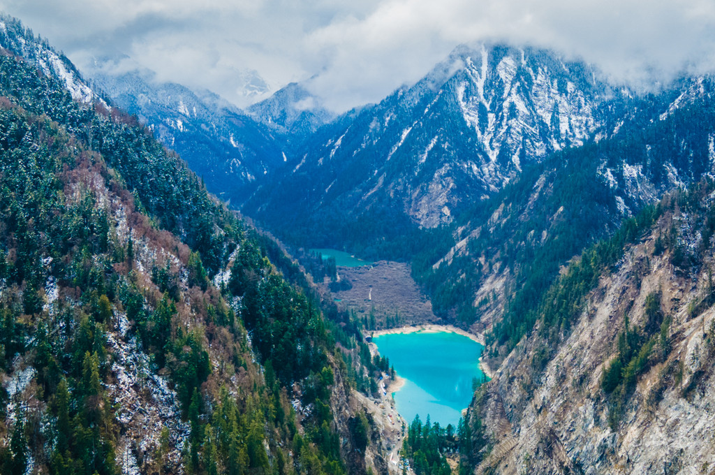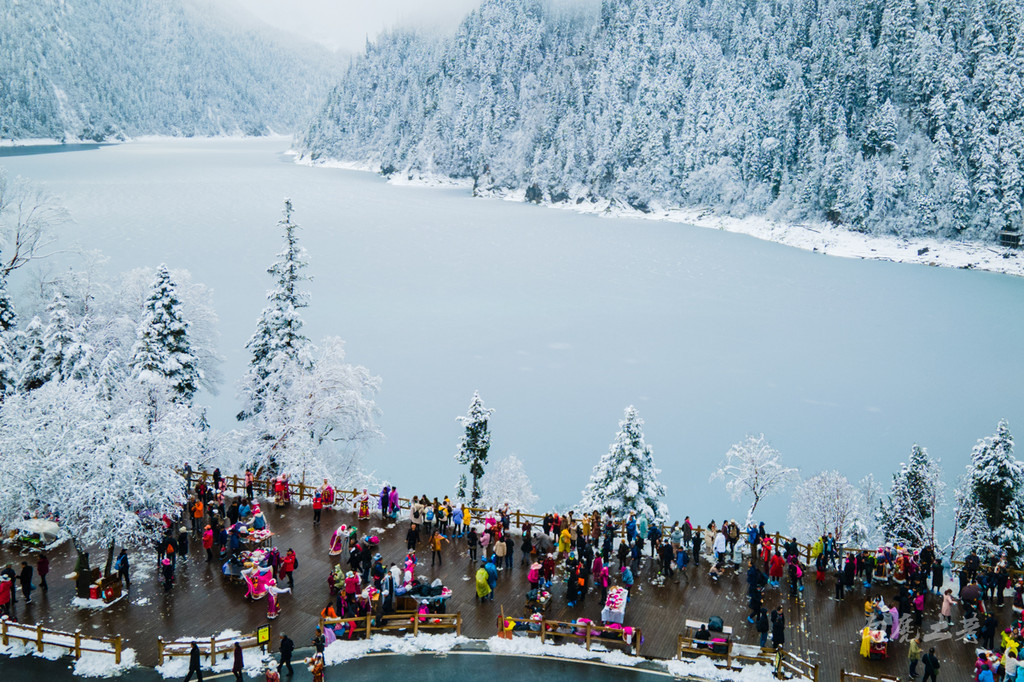 由于昨夜的一场春雪,九寨沟一半银装一半苍翠,海拔3000多米的长海四周银妆素裹,长海顺山弯去,头深藏在层峦叠嶂的山谷之中,冰面也尚未融化,忽然回到了冬天。