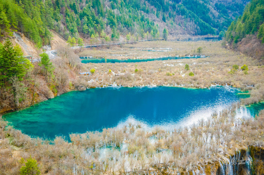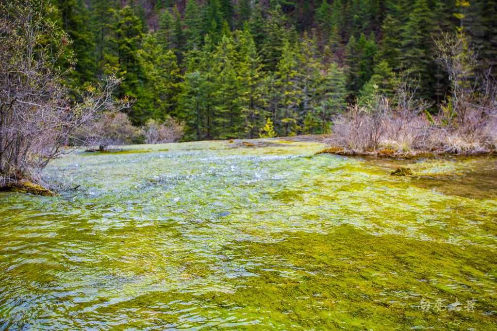 从诺日朗瀑布出来就是往出口方向,也是树正沟方向,顺沟叠延五、六公里,盆景海、芦苇海、火花海、卧龙海、老虎海,树正群海由大小几十个海子所组成,犹如碧绿的翡翠,镶嵌在这深山幽谷之中,中间由绿树、银色的小瀑布相连,就如给树正寨带上了一条美丽的翡翠项链。这一段美景相连,适合步行游览,时间晚了景交车会催促,他们下班前要把所有游客带出沟,所以建议多留一些时间在这里。