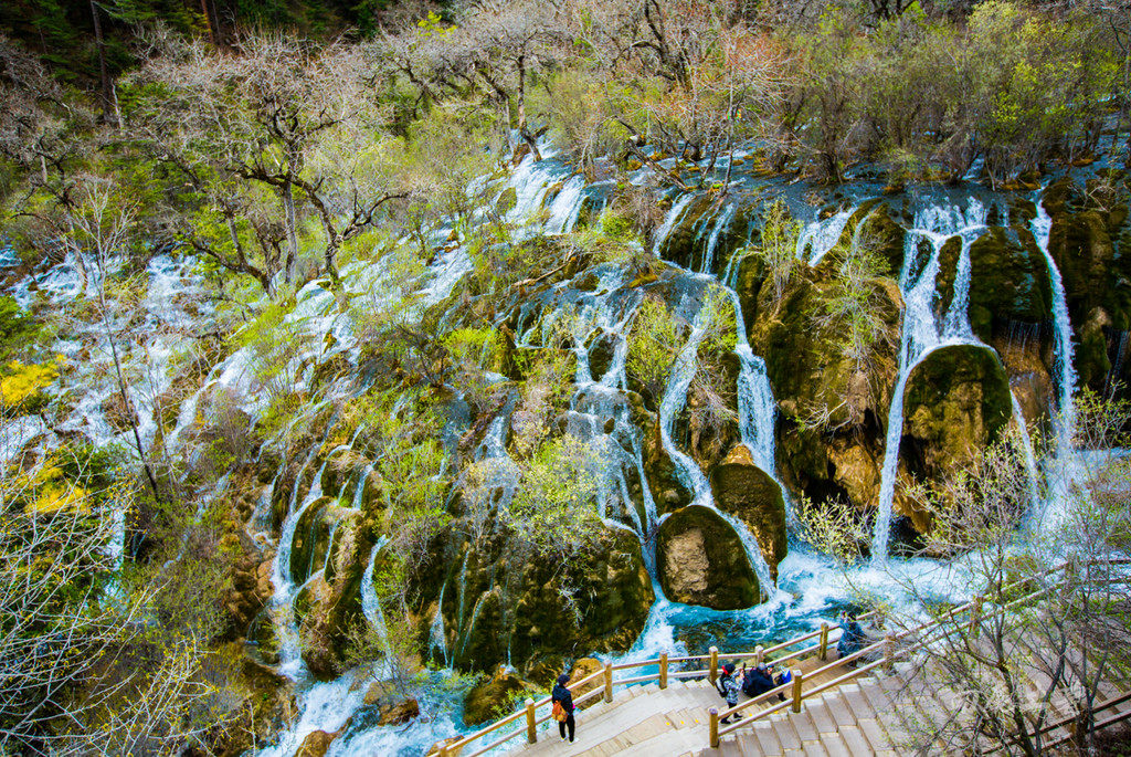 五花海的下游是四周长满松、杉树木的珍珠滩瀑布,这一段几个点可以步行前往,从公路上下去,一条木栈道穿行于珍珠滩,薄薄的水层从滩面上淌过,阳光照射下,若万颗明珠,闪着银光,然后落入瀑布。
