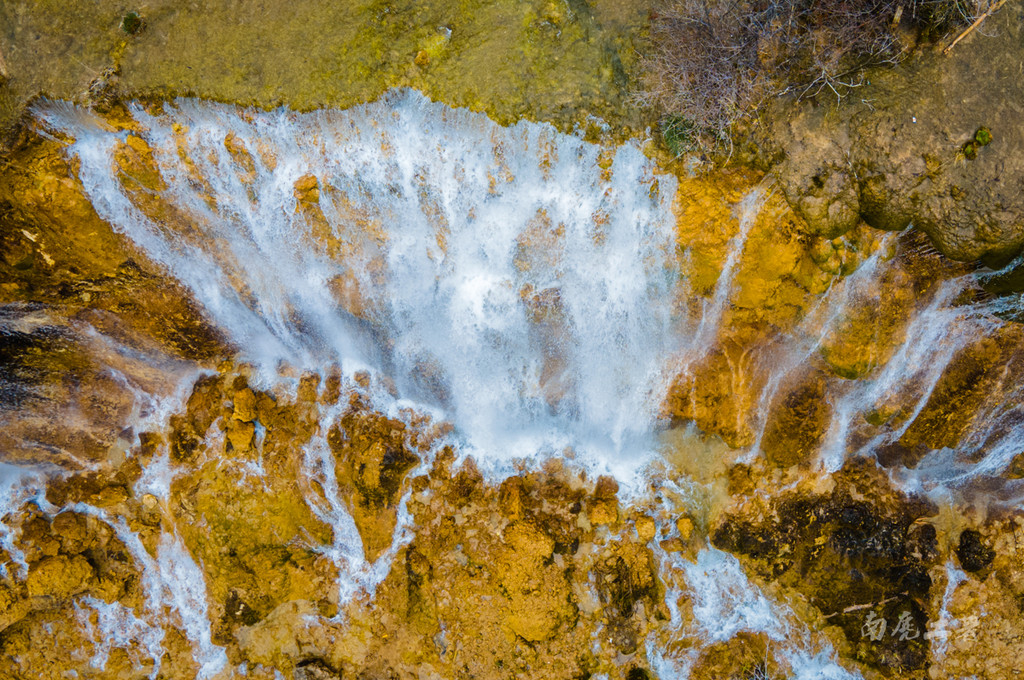 还记得曾经霸屏的86版《西游记》吗?九寨沟取景瀑布是珍珠滩,还是诺日朗,一直有争论。我穿过珍珠滩往下走,瀑布水经一个约20几度倾角的滩面缓缓流淌之后,跌水成直角,全程钙化有鳞片,水到之处色彩斑斓,见珍珠滩瀑底观景台立有一块牌,证实《西游记》拍摄地。