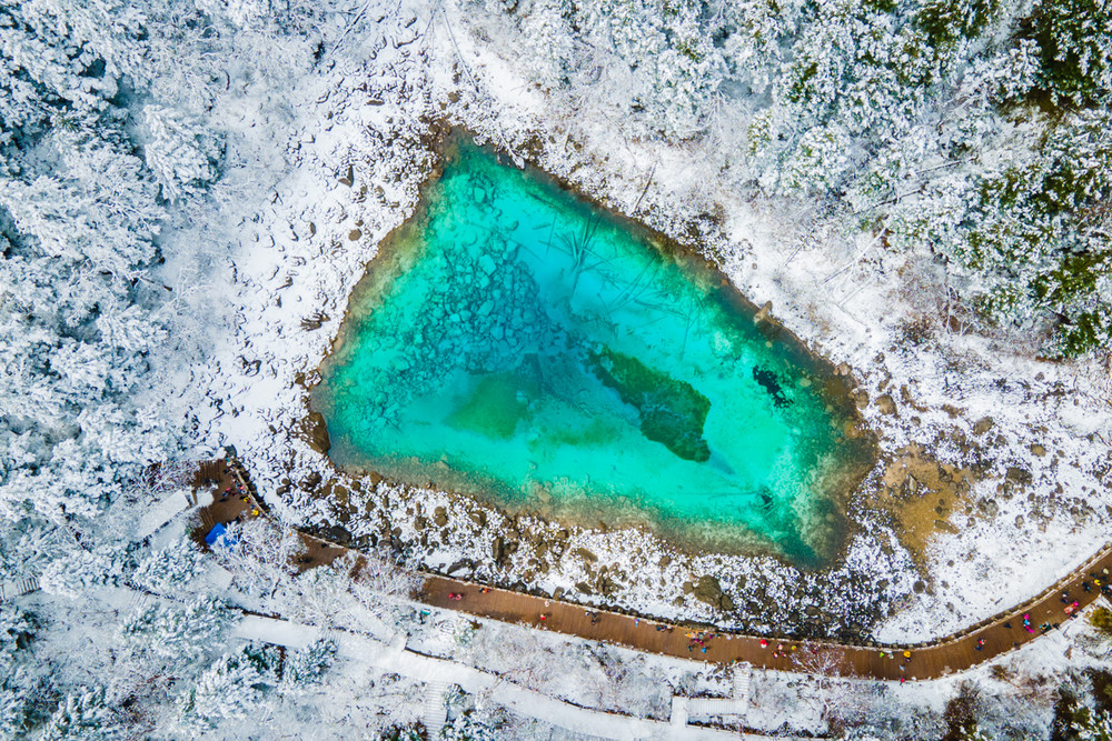 从长海下行1公里左右,五彩池就深藏于公路下边的深谷中,一场雪给森林披上银装,五彩池就如一块巨大的蓝宝石一样藏在密林之中,它是九寨沟最小、最艳丽的池子,以秀美多彩,纯洁透明闻名。
