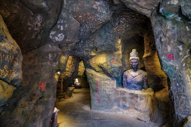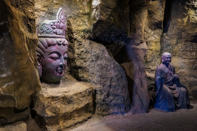 在色嬷巨大的造像后面,有一个千佛洞,里面有许多神态各异的佛塑像,庄严慈祥。