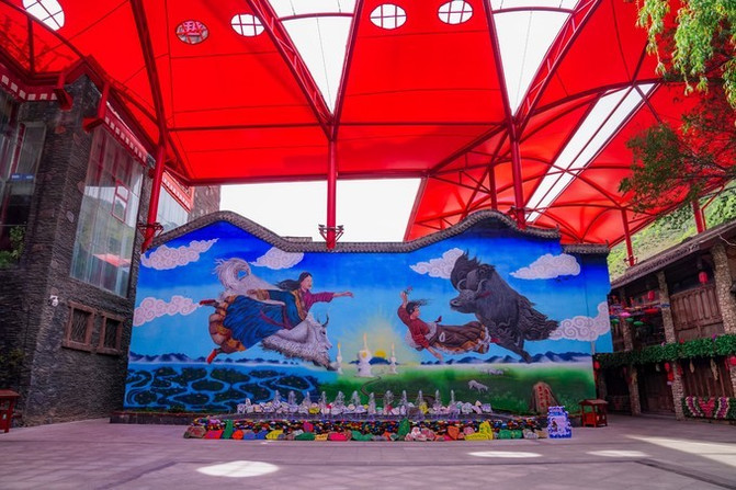 从游客中心检票进入园区,充满异域风格的民族巨幅壁画出现在眼前,面前的池水喷泉,是第一个网红互动体验项目——喊泉,许多游客来到这,都会一较高下,看谁的嗓门更大,十分的有趣。