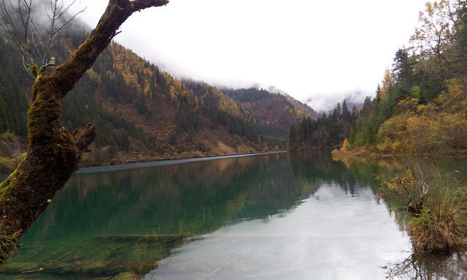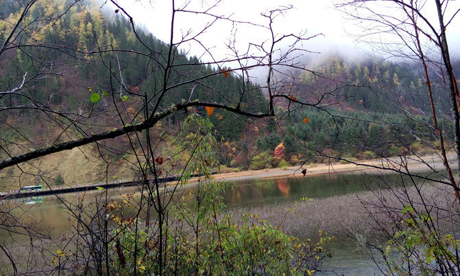 这样想着走着,九寨沟景区大门就出现在面前。入口大门比黄龙的宽了很多,也不需要坐缆车,所以排队进去的时候还是比较快的。在排队上观光车的时候,天果然下起了小雨,不一会越下越大,我们不得不拿出雨衣穿上。这个时候我真的恨不得扇自己一耳光,因为提前买的雨衣被我放在车上的行李箱里,并没有放在身上的小包里,现在我只有一件很烂的赠品雨衣,还是套头的,看着自己穿的像包子一样的身材,我心里数万只草泥马呼啸而过,真想把这件雨衣撕的粉碎。不过最终理性战胜了冲动,我拿出雨伞撑起来,然后把雨衣套在了小包上面,就这样随游客队伍往前等着上观光车。九寨沟已经开发出来的有三条沟,每条沟都长短不一,长的坐观光车开到底要半个多小时的时间,短的也要一二十分钟,靠步行肯定是不可能的,除非你能在这里花三天的时间,所以游览方式都是靠600多辆观光车的不停穿梭。三条线路交汇处是沟内唯一的游客服务中心,也是唯一的吸烟点,所有的观光车都是在这里统一调度决定先去哪条沟,决定好以后观光车会沿着马路一路开到每条沟的最高点,然后游客就沿着游览栈道慢慢往回游览。距离相隔较远的景点都能上下车,所以我们可以看完这个景点后立马乘车去下一个景点。我们最先游览的是日则沟,听了导游的话,没有去到日则沟最高点的原始森林,而是在箭竹海就下车了。其实在观光车上导游就已经沿途简单介绍了各个景点的由来和传说,我们也匆匆欣赏过这如画的美景,但是当终于下车,自己亲自走进这个童话世界时,还是被深深震撼了。这些大大小小的湖在这里被叫做海子,每个海子都有自己的传说和特点。此时映入眼帘的是箭竹海,由于是这一条沟最里面的一个海子,相比于外面的海子,多了几分深沉与宁静。水面并没有多宽阔,岸边还有很多像芦苇的植物。由于刚刚下过雨,栈道两旁的植物上还挂着很多晶莹剔透的水珠,风一吹,就落到水面上,泛起阵阵波纹。