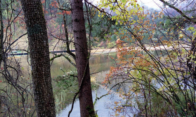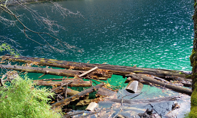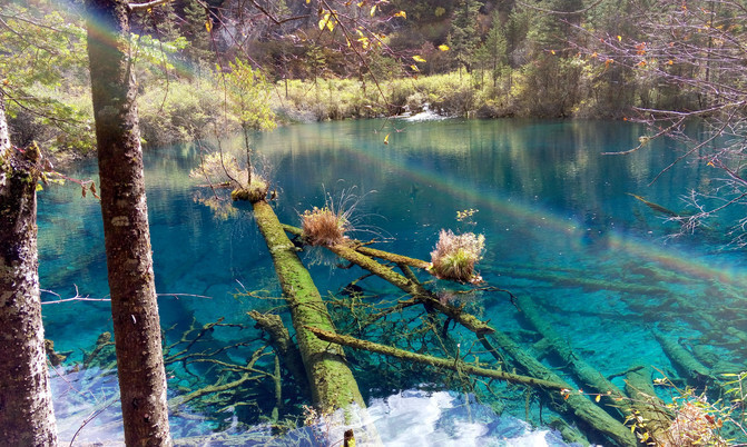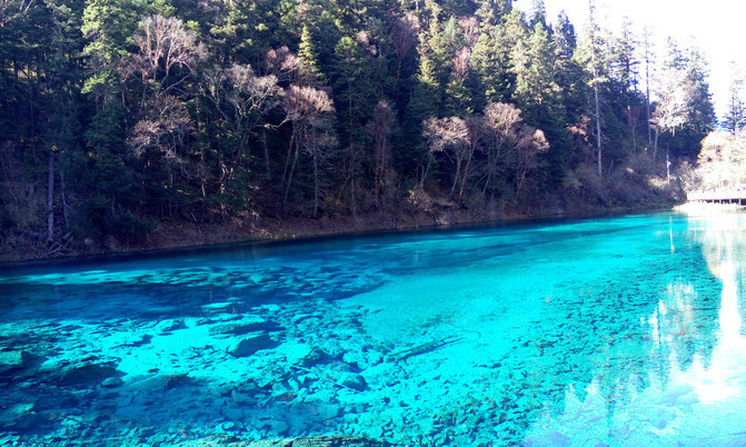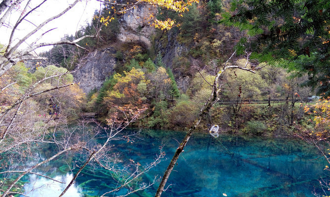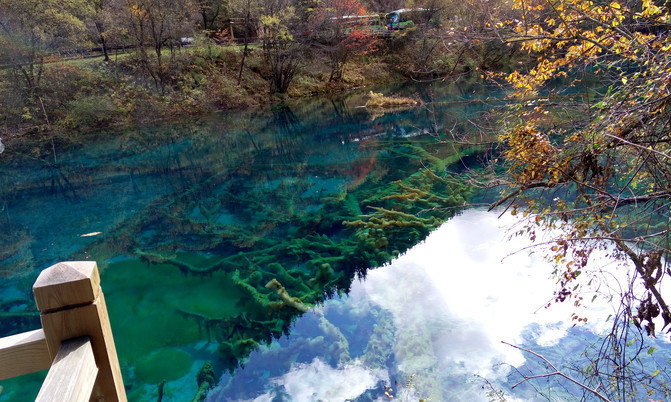 从长海下来就到了九寨沟的第二个精华—五彩池。九寨沟的五彩池和黄龙的五彩池不同,它只有一个池子,并且比较小,但是却有着其他海子不具备的另一个色彩。除了清澈见底的绿,还有一种特别的荧光绿,不知道是光的折射还是池子里有独特的矿物质,这一深一浅,一动一静,把五彩池装点出一种惊心动魄的美。由于小,海子边被人群围得更加难以接近,好不容易用自拍神器拍了一张全貌,照片里面还满是其他人的手机画面,看来对于大美,所有人的审美都是一致的。