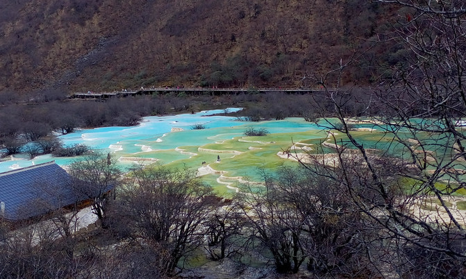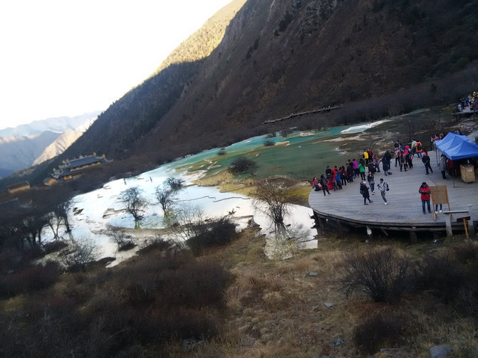为了避免零散预定各个地方的酒店和景点门票,我们提前预定了25号到27号的成都—黄龙—九寨沟三天两晚旅行团,现在想想,这个决定是非常明智的,一路上的吃住行有导游的安排,确实省了不少心。由于发车时间是凌晨五点半,第二天凌晨四点我们就起床了,迷迷糊糊收拾完就到酒店大堂等着来接车的人,这也是跟团的一个好处之一,不用自己去张罗车。成都离黄龙和九寨沟有8、9个小时的车程,为了不耽误当天游览黄龙的时间,一般旅行团发车都特别早,睡眠肯定是不足的,上车后听完导游一大通的介绍和要求,一大车子人便迷迷糊糊睡着了。一直到早上七八点,天已经蒙蒙亮了,导游又开始“耍嘴皮子”了,由于早上没吃什么东西,舟车劳顿,加上耳朵里导游嗡嗡嗡的声音,内容又是汶川地震,死了多少人之类的,胃有点翻江倒海的意思了,真想大吼一句“闭嘴”,可惜没有这个勇气得罪接下来几天操纵我生活的人。晕车药这种东西对于长途汽车真的太重要了!所幸中途经过一个停靠点,下车透了一下气,才免于呕吐之罪。沿路的停靠点的卫生间都是居民自己经营的,所以都要收费1元,条件是各种恶心,我已经不想回顾了。中午到达一个酒店吃了饭,哦,应该是充了一下饥而已。对于饭菜,导游提前已经打过预防针了,我本人其实对饭菜也没有多大的要求,但是连我也说不好吃的,那是真的难吃了。不过没办法,人在屋檐下,将就一下也是必须的。下次一定要自备老干妈之类的,保管你吃饭香香,身体倍棒!吃完饭便马不停蹄出发了,一路上沿着s型的山路蜿蜒而上,路两旁的山峰越来越陡,山上植物的颜色也越来越多,给人一种即将驶入世外桃源的错觉。不过左右不停摇摆的汽车老是将满心的向往拉回现实。一直这样兜兜转转到下午两点的样子,终于到达了离黄龙景区最近的一个医疗服务站,车停稳后上来了一个工作人员给我们讲解了一下景区游览以及高原反应应该注意的事情。对于高原反应,刚来的时候确实没有做过多的了解,只是简单买了一盒红景天的胶囊,没想到这种胶囊要提前一个星期服用的,当下吃并不没有多大用处,没办法,为了自己身体着想,加上已经开始出现一点点胸闷气短的感觉,含泪买了一盒。这里也要强调一点,高原反应确实不容小觑,如果有去海拔较高的地方旅行,一定要提前做好准备,不管是提前吃药还是买这种当下喝的口服液,外面比景区买便宜很多,如果真的没有准备,也不要为了省几块钱而冒险不吃,毕竟好的身体才是一切的根本。喝完药没多久车就开到了黄龙景区大门口,但是没有车没有停,一直沿着长长的游客队伍没有尽头的继续向前,排队的队伍一直往后延伸了三四百米,比我见过的长隆旺季的队伍还要长!心顿时凉了一节,这要排到什么时候啊?!导游也有点着急了,还没等车停到队尾就催促我们赶紧下车排队。一下车一股凉意就扑面而来,现在已经到了海拔3200左右的地方,虽然阳光灿烂,但是温度挺低的,不由得裹了裹身上的衣服。