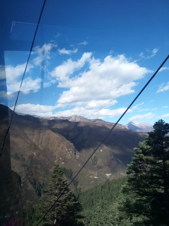 景区入口建在山谷之中,两座山相隔并不宽,抬头望去,蓝天白云犹如一副狭长靓丽的油画盖在山尖。排队走道的右边就是一条小溪,溪水潺潺流过,清澈悠扬。不知道从什么时候开始,凡是映入眼帘的景色,都成了一幅幅美丽的图画,这也许就是这个地方的魅力。排了大概四十多分钟,我们就坐上了上山的索道。可能是每天需要接待的游客很多,索道运行的速度相对较快,恐高的朋友建议一定不要睁开眼睛,真的太刺激了!随着索道上升,视野逐渐脱离了山谷的束缚,被远方其他的高山填满。不知道是因为快速上升的高度还是看到远处的壮丽山峰,心脏跳动得越来越快,不过这种感觉随着山顶的到达迅速消失,说真的,还有点意犹未尽的感觉。