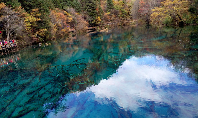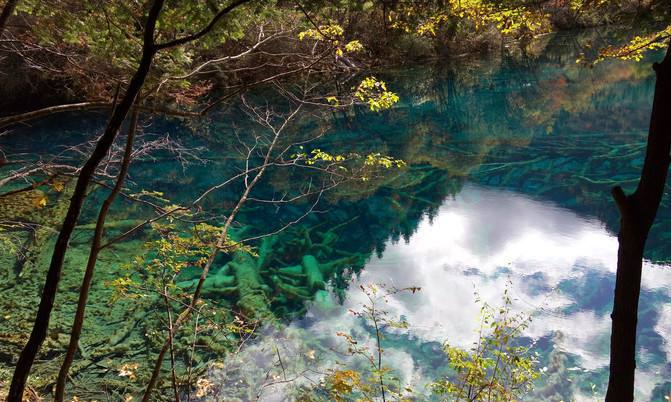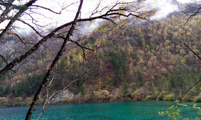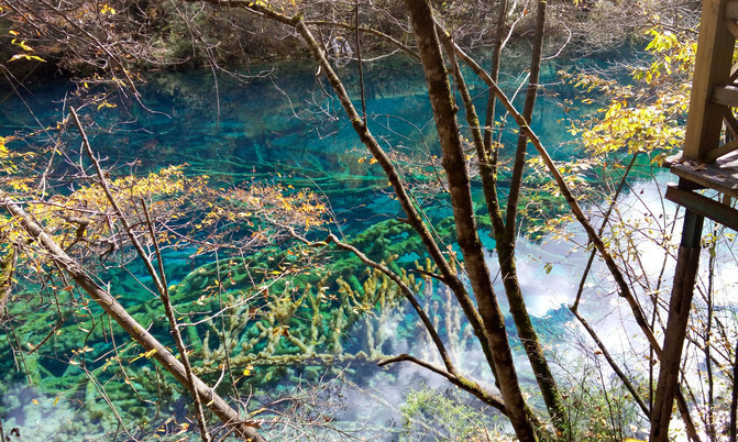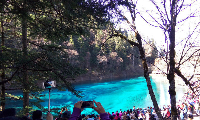 从长海下来就到了九寨沟的第二个精华—五彩池。九寨沟的五彩池和黄龙的五彩池不同,它只有一个池子,并且比较小,但是却有着其他海子不具备的另一个色彩。除了清澈见底的绿,还有一种特别的荧光绿,不知道是光的折射还是池子里有独特的矿物质,这一深一浅,一动一静,把五彩池装点出一种惊心动魄的美。由于小,海子边被人群围得更加难以接近,好不容易用自拍神器拍了一张全貌,照片里面还满是其他人的手机画面,看来对于大美,所有人的审美都是一致的。
