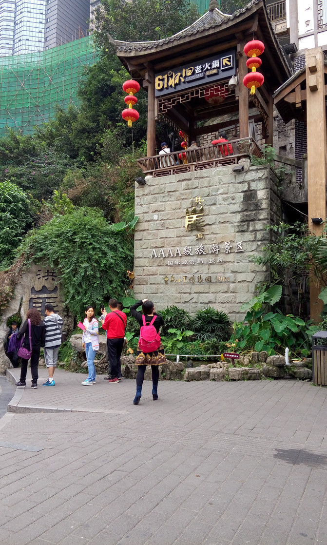 这一觉睡得特别舒服,第二天早上七点闹钟响的时候我还以为是在做梦。因为最后一天的行程是要去重庆,买了上午十点五十的动车票,所以也没敢多睡,洗刷完就匆匆出门了。十点到达成都东取完票,回头望了望成都这座城市,就一头扎进了候车室。在动车上一直回忆着这趟旅途的点点滴滴,都没有欣赏沿途的风景,不知不觉就到了山城—重庆。山城之名果然名不虚传,在的士上往窗外看,随处可见如山一样的高楼,道路崎岖又狭窄,车开两步就要上一个坡,坡度还不是一般的陡,就算是市中心,都还能看到低矮的小山丘,所以绿化程度很高,山城山城,山在前,城在后,不是山顺应了城市的发展,而是城市迁就了山的坚韧不移。的士师傅推介了重庆解放碑一家还不错的豌杂面,据说还上了很多电视什么的。因为离洪崖洞比较近,我们就顺道去试了试这家的面,说实话,还好。不知道怎么回事,一下动车我就对这座城市有股莫名的不喜欢,没有成都一半的好感,也许是感觉重庆人都比较冷漠吧。吃完面拖着行李不知道往哪走,拖着行李箱逛景点真的不是一个明智的选择,人来人往的,有点尴尬。所以到了洪崖洞门口后我就决定留下来看行李,不进去了。郭枫一个人逛着没意思,加上身体也有点不舒服,没一会就出来了。