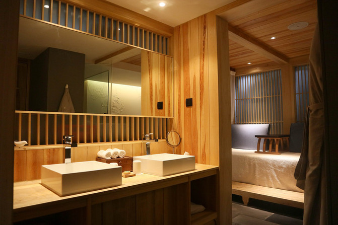 洗漱区:值得一提的是洗漱区是干湿分离的,可以冲澡也可以躺进浴缸泡澡,酒店还特别提供了浴盐。