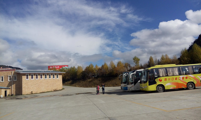 为了避免零散预定各个地方的酒店和景点门票,我们提前预定了25号到27号的成都—黄龙—九寨沟三天两晚旅行团,现在想想,这个决定是非常明智的,一路上的吃住行有导游的安排,确实省了不少心。由于发车时间是凌晨五点半,第二天凌晨四点我们就起床了,迷迷糊糊收拾完就到酒店大堂等着来接车的人,这也是跟团的一个好处之一,不用自己去张罗车。成都离黄龙和九寨沟有8、9个小时的车程,为了不耽误当天游览黄龙的时间,一般旅行团发车都特别早,睡眠肯定是不足的,上车后听完导游一大通的介绍和要求,一大车子人便迷迷糊糊睡着了。一直到早上七八点,天已经蒙蒙亮了,导游又开始“耍嘴皮子”了,由于早上没吃什么东西,舟车劳顿,加上耳朵里导游嗡嗡嗡的声音,内容又是汶川地震,死了多少人之类的,胃有点翻江倒海的意思了,真想大吼一句“闭嘴”,可惜没有这个勇气得罪接下来几天操纵我生活的人。晕车药这种东西对于长途汽车真的太重要了!所幸中途经过一个停靠点,下车透了一下气,才免于呕吐之罪。沿路的停靠点的卫生间都是居民自己经营的,所以都要收费1元,条件是各种恶心,我已经不想回顾了。中午到达一个酒店吃了饭,哦,应该是充了一下饥而已。对于饭菜,导游提前已经打过预防针了,我本人其实对饭菜也没有多大的要求,但是连我也说不好吃的,那是真的难吃了。不过没办法,人在屋檐下,将就一下也是必须的。下次一定要自备老干妈之类的,保管你吃饭香香,身体倍棒!吃完饭便马不停蹄出发了,一路上沿着s型的山路蜿蜒而上,路两旁的山峰越来越陡,山上植物的颜色也越来越多,给人一种即将驶入世外桃源的错觉。不过左右不停摇摆的汽车老是将满心的向往拉回现实。一直这样兜兜转转到下午两点的样子,终于到达了离黄龙景区最近的一个医疗服务站,车停稳后上来了一个工作人员给我们讲解了一下景区游览以及高原反应应该注意的事情。对于高原反应,刚来的时候确实没有做过多的了解,只是简单买了一盒红景天的胶囊,没想到这种胶囊要提前一个星期服用的,当下吃并不没有多大用处,没办法,为了自己身体着想,加上已经开始出现一点点胸闷气短的感觉,含泪买了一盒。这里也要强调一点,高原反应确实不容小觑,如果有去海拔较高的地方旅行,一定要提前做好准备,不管是提前吃药还是买这种当下喝的口服液,外面比景区买便宜很多,如果真的没有准备,也不要为了省几块钱而冒险不吃,毕竟好的身体才是一切的根本。喝完药没多久车就开到了黄龙景区大门口,但是没有车没有停,一直沿着长长的游客队伍没有尽头的继续向前,排队的队伍一直往后延伸了三四百米,比我见过的长隆旺季的队伍还要长!心顿时凉了一节,这要排到什么时候啊?!导游也有点着急了,还没等车停到队尾就催促我们赶紧下车排队。一下车一股凉意就扑面而来,现在已经到了海拔3200左右的地方,虽然阳光灿烂,但是温度挺低的,不由得裹了裹身上的衣服。
