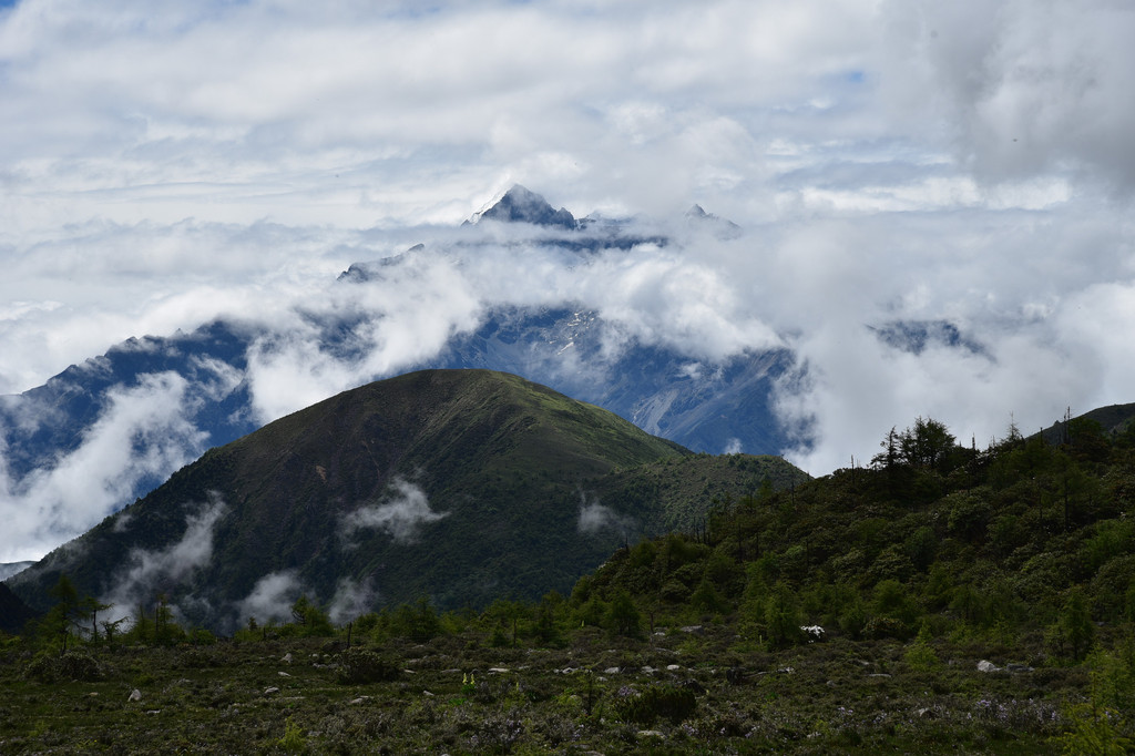 6月24日,我们从康定出发,进入木格措景区。乘着观光车,沿着蜿蜒曲折的盘山公路到了山顶观光区,木格措像一块大宝石,清澈透亮(图8)。骑马走过鲜花盛开的山坡,来到海拔4200米的垭口。云环雾绕贡嘎山主峰孤高突兀,显得神秘,峰顶偶露,雄浑巍峨(图9)。