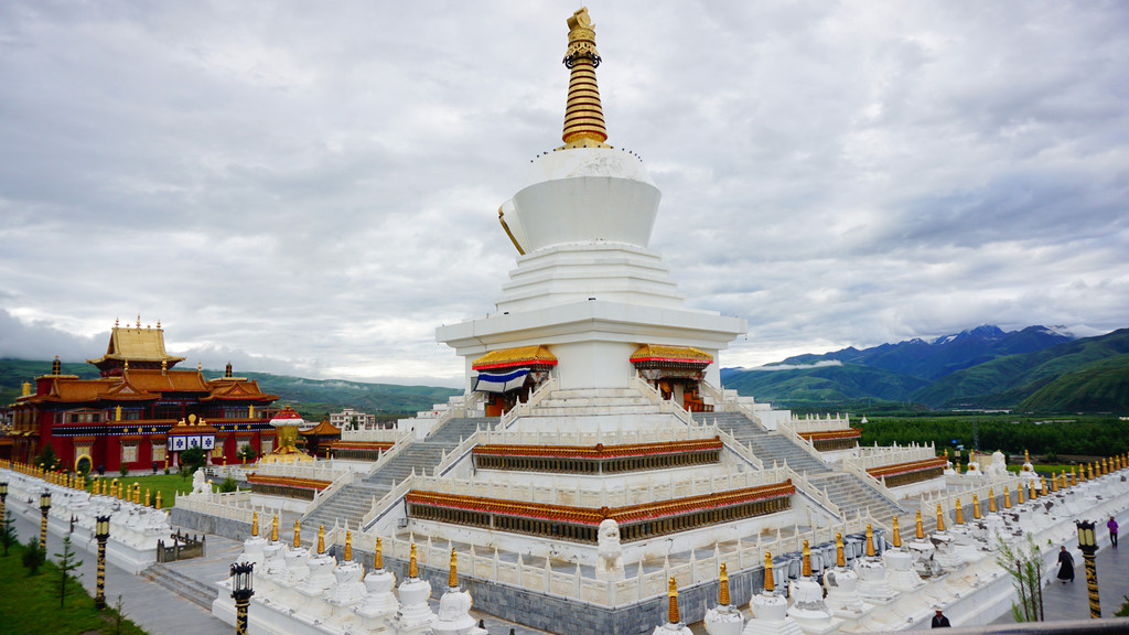 6月29日,早上醒来推开窗,雪峰在望。甘孜县城周围好几座雪山环绕。阳光透过云层缝隙照在雪峰下高原,恍如仙境。顺便去白塔转转(图17),看到很多信众到白塔礼佛,他们绕着白塔一边行进,一边念经,也有虔诚的绕塔磕长头,佛殿内也有僧侣在念经。