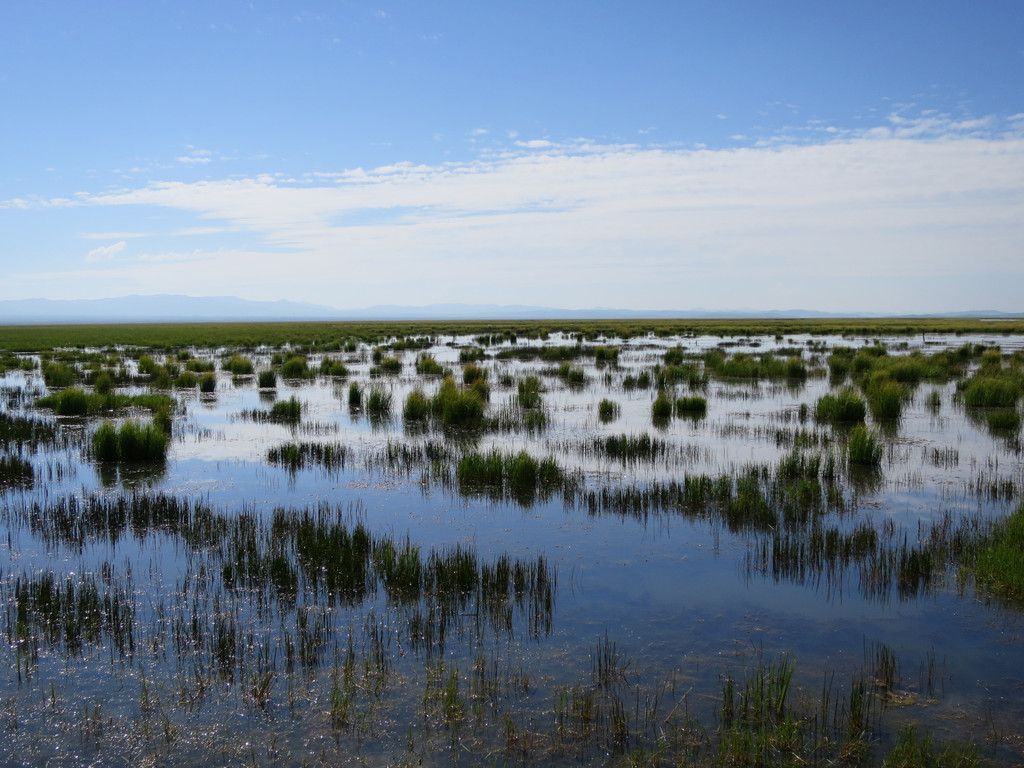 2015年夏天去甘南郎木寺时,临时起意,自驾到浩渺的若尔盖湿地,无意之中又到川西。夏日的花湖开满了绚烂的花朵,红的、粉的、黄的,各种不知名的小花儿,在绿草丛中争相斗艳。湛蓝的湖水被染成淡淡的藕色,五彩缤纷,好像云霞委地。极目远眺水天一色,绿草野花令人心旷神怡,烟波苇荡令人肺腑尽涤(图4)。