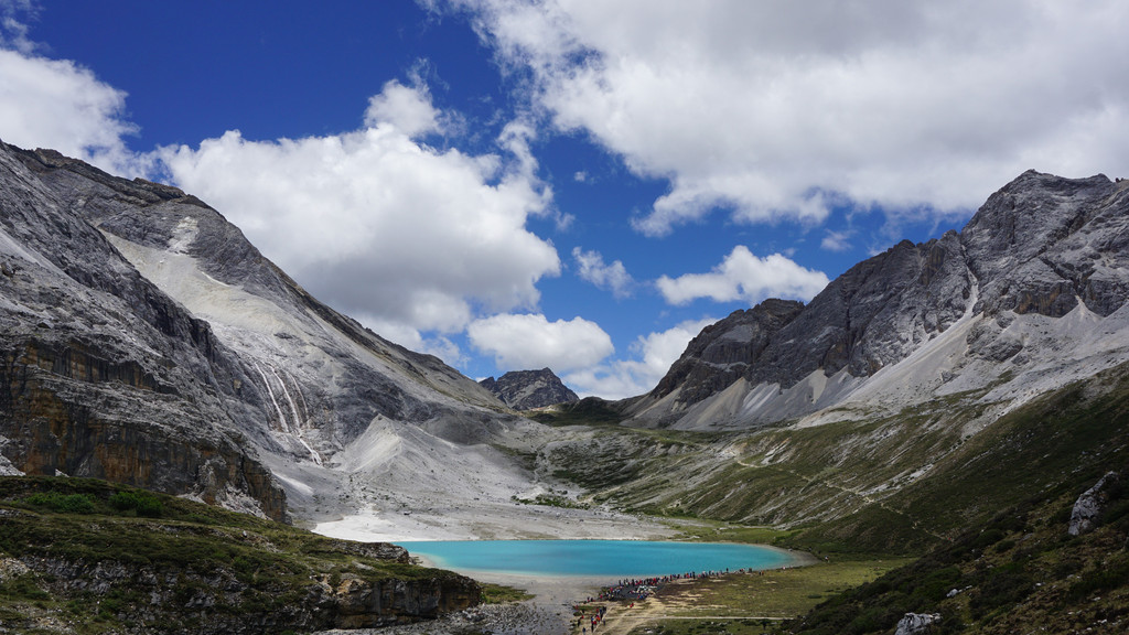 从洛绒牛场电车站下来,走过一个湿地草甸,到特种马场骑骡子上山。下骡后,开始在陡峭山路上艰难的向上攀爬,大约走1小时左右,到达一个三岔路口,向左是平路到牛奶海,同伴中有高反严重、体力不支的,就选择了这条路。我们向右爬上500米左右陡坡,再往前翻过一座高坡后,五色海(图12)出现在央迈勇雪峰(藏语意为“文殊菩萨”,海拔5958米。)环抱之间。因为有雪山、草甸的倒影,水色便显得缥缈奇幻。左边望去,雪山环绕的牛奶海(图13)、状如水滴,它中间是碧蓝的雪水,周边一圈乳白色的水环绕。环顾四周,央迈勇和夏诺多吉雪峰(藏语意为“金刚手菩萨”)仿佛伸手可及(图14)。沿三棱锥状雪山两翼锋利的刃脊蜿蜒绵亘,刃脊背向光线的一侧呈暗影,蓝天中所勾勒出的线条尖锐有型。沿着山脊往前走,一边欣赏这雪山和海子,这里的一切都是那么的纯粹和梦幻。