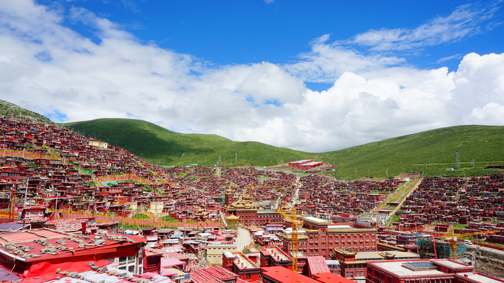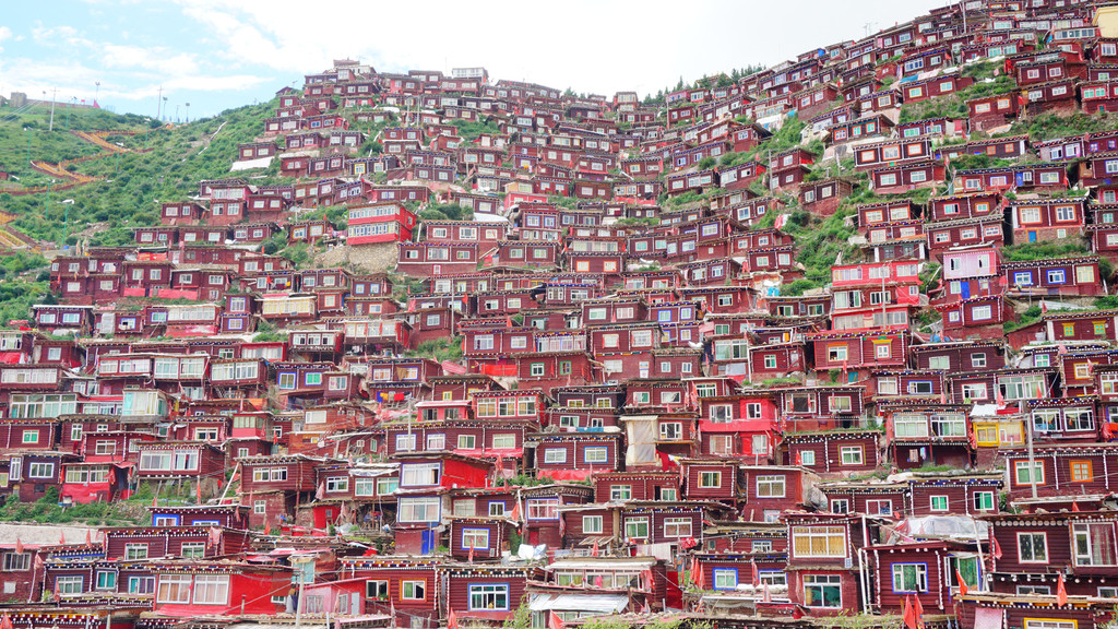 我们拾阶而上,爬到了山顶,放眼望去,只见沟里的僧舍,以佛学院的大经堂为中心,密密麻麻搭满了四面的山坡,不计其数的绛红色小木屋,延绵无数,一眼望不到头(图19)。这些红房子,是一万多名僧侣的住所。来到这里,无不被这炙热的红房子和虔诚的朝圣者,所深深震撼!