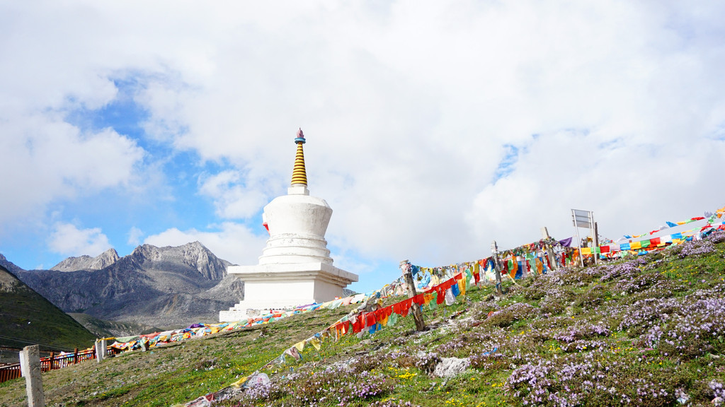 接着翻越折多山,沿着九曲十八弯盘山公路,一个弯接着一个弯,爬行老半天到达海拔4298米垭口观景台(图10),湛蓝的天空下,经幡被风吹的猎猎作响。山坡上一望无际的格桑花,成了紫色的海洋。临近新都桥时,路边有一个观景台,骑马爬上高坡可以看到白雪皑皑的贡嘎山主峰。我们在不同的时间,从三个相隔甚远的地方,不同角度瞻仰贡嘎山,可见蜀山之王的伟岸。