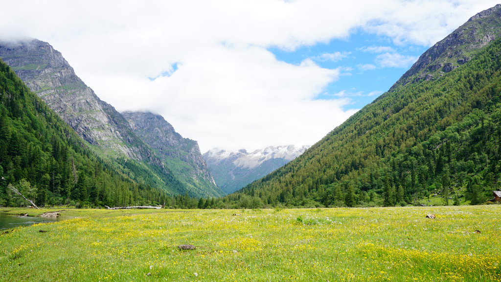 6月27日,二进亚丁。天气不错,乘景区中巴进去的路上就可以看见三大神山美丽的雪峰。换乘电瓶车去海拔4150米洛绒牛场。牛场周围是连绵的高山草甸,初夏时节草甸上野花盛开,漫山遍野,成群的牛羊在河边和山坡上悠闲的吃草,不远处三大雪峰伫立,一派和谐景象。