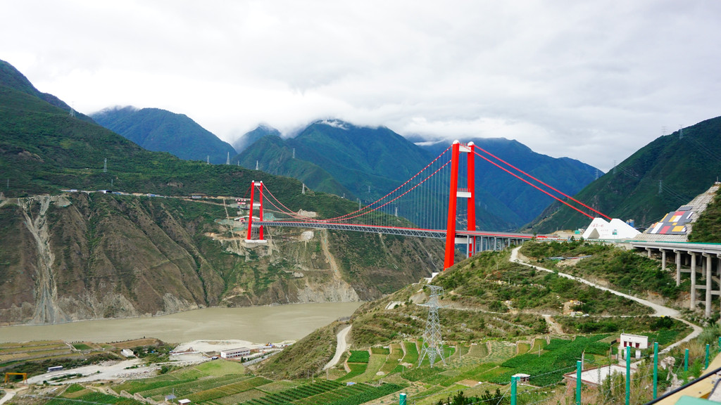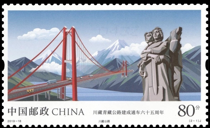 2019年6月22日,几个朋友一起一早从宁波出发,开始川西大环线自驾游。开了两天车,行程2200多公里,23日下午18点左右经过横跨泸定县大渡河上的泸定大渡河大桥。过桥后,我们岸边停车回望,只见红色的钢桁梁悬索桥高悬在河上,气势夺人,格外醒目震撼(图6)。两岸高山陡立,白云在山顶缭绕,大渡河水汹涌澎湃,奔流不息。1个多月后,《川藏青藏公路建成通车六十五周年》邮票发行,“川藏第一桥”登上国家名片(图7)。日暮之际到达跑马山下充满藏族风情的康定城。