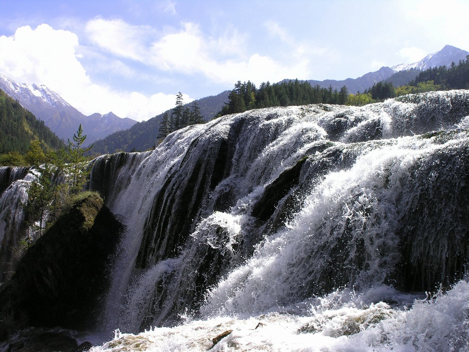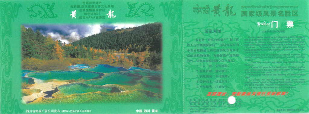 1996年6月,从成都出发西行,第一次进入川西,来到童话世界九寨沟。恬静的镜湖、俊美的翠湖、秀丽的芳草湖、深沉如墨玉的长海、神奇的五彩湖、奇异的流翠滩、激流飞泻的珍珠滩(图1),壮阔的诺日朗瀑布……湖泊与瀑布、溪流、河滩、山泉交错映衬,风光如诗如画;在岷山主峰雪宝顶下,黄龙就如巨型的钙化坡谷,宛若金色“巨龙”腾游天地。景区内遍布着众多的岩溶湖泊,清澈的湖水与湖底广泛分布的大量钙华沉积物、藻类等共同构成五彩斑斓的湖泊景观,大大小小的池子,在阳光的照射下,闪着耀眼的波光,构成一个个五彩斑斓的瑶池玉盆。当时,还没有发行相关邮票,只在沿途寄了一些明信片,留了几个邮戳(图2)。