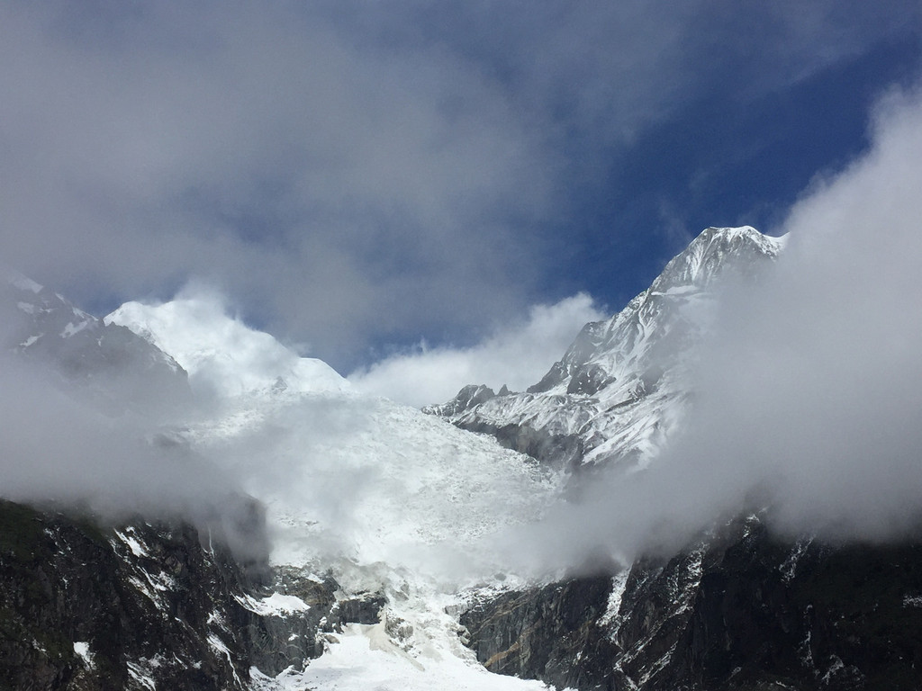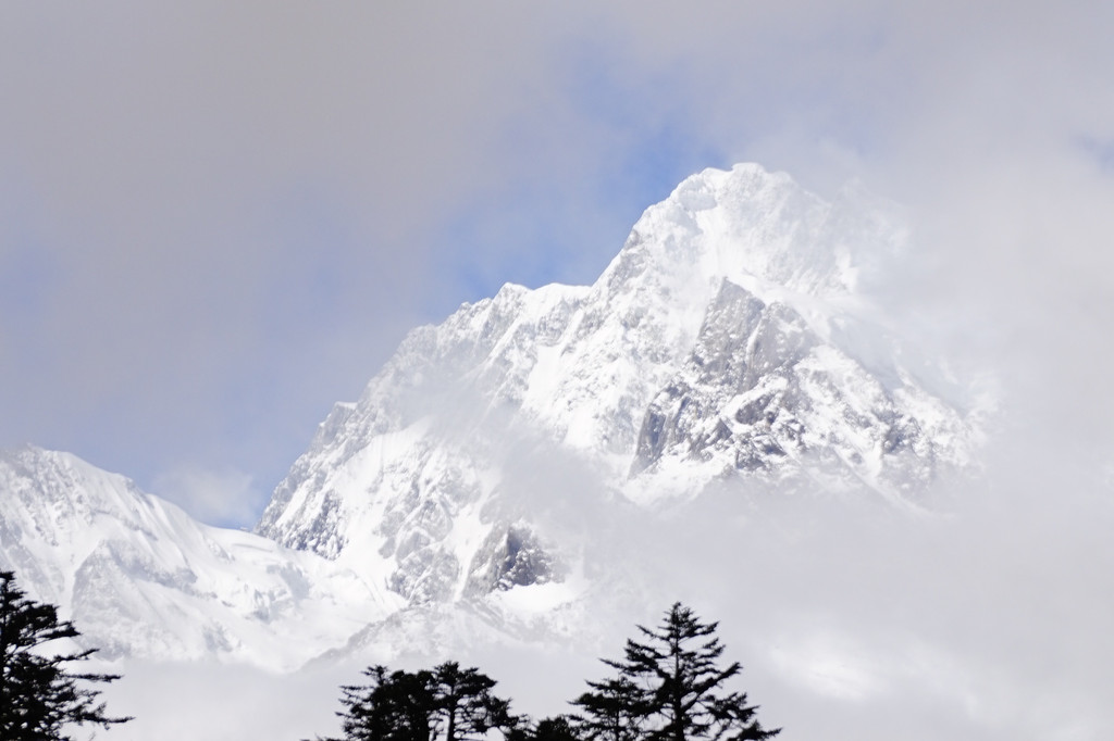 2016年春月从成都开车到磨西镇,游览海螺沟。森林里飘摇的松萝垂挂在树枝之上,云雾在山间缥缈,美的如梦似幻。晶莹的现代冰川从高峻的山谷铺泻而下,令人震撼。当笼罩多日的云雾散开、掀开神秘的面纱,贡嘎主峰在阳光下熠熠生辉,肃穆庄重(图5),现场的游客惊呼膜拜。为了这神圣一刻,有些游客已经在此等了足足一周。