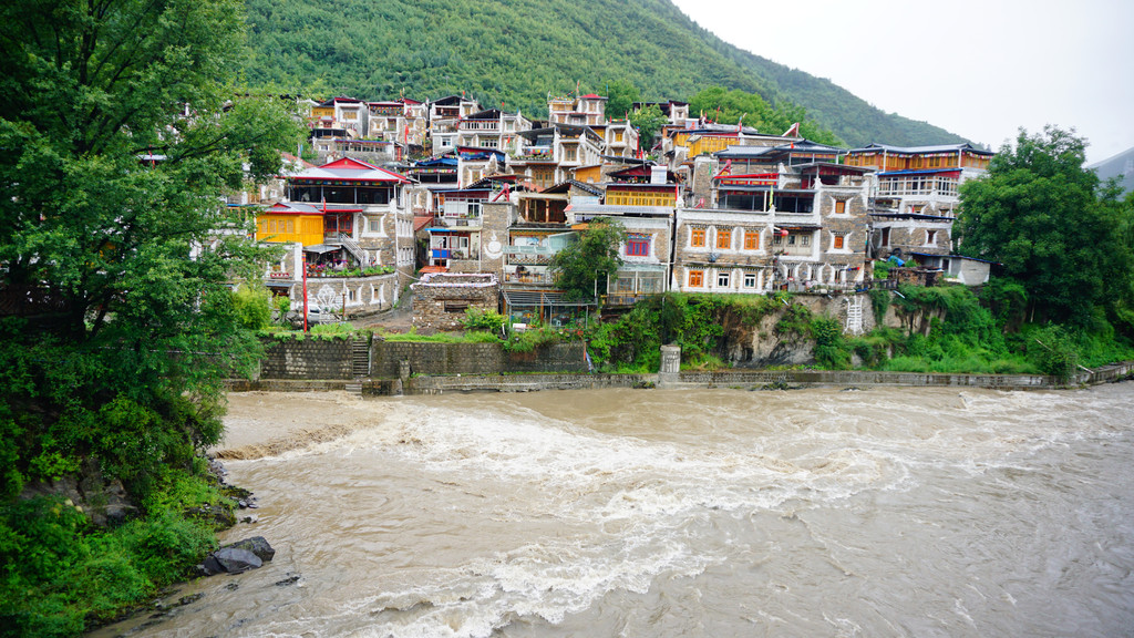 6月30日早上从观音桥出来,沿大金川河边的317国道前行。一路上看到山坡上的松岗碉楼、依山而建卓克基土司官寨和面河背山的西索民居(图20)。从马尔康转入S210省道,路况更差,到处都是落石和塌方。感谢护路工人的及时清理,我们得以继续前行。10点左右经过梦笔山垭口,这是马尔康通往小金县的唯一通道,也是中国工农红军长征时翻越的第二座大雪山,在山麓立着“雪山红路”纪念雕塑。过两河口会议旧址不久,在木坡乡遇到严重的山体滑坡。4台大型挖掘机和推土机在现场协同作业,终于在40分钟后给我们挖出一条路来。