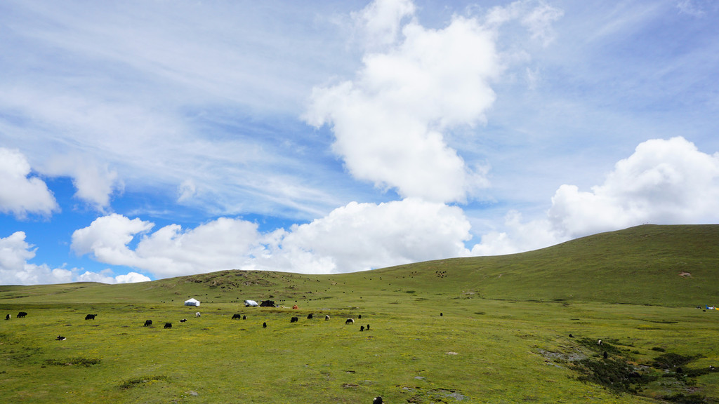 新都桥是国道318线上的重要集散点。远处的山峦,近处的牦牛,五彩的藏式民居,青青的草地……就如一幅巨型油画。一切都是那么安谧,我们就在这小憩。