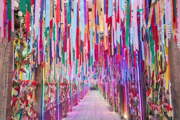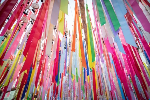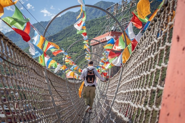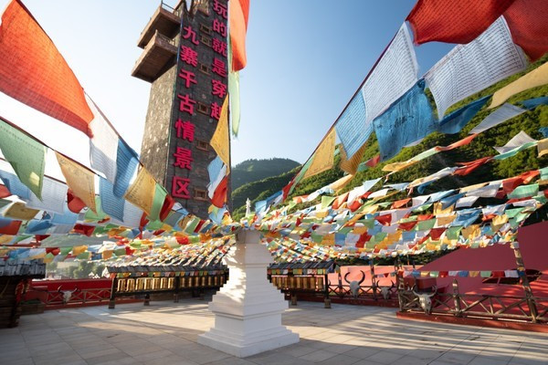 景区内有两座藏族碉楼,其间有一座“同心桥”相通,桥上的五彩经幡随风翻飞飘扬,又因它连接起了两座碉楼,于是也有人笑称为“鹊桥”。我们可以登上“鹊桥”上俯瞰全景,将九寨沟风光尽收眼底。