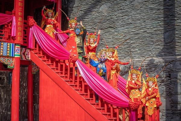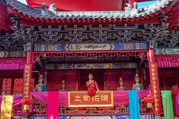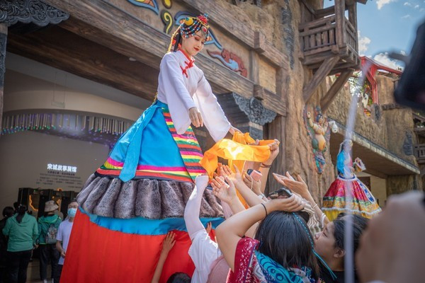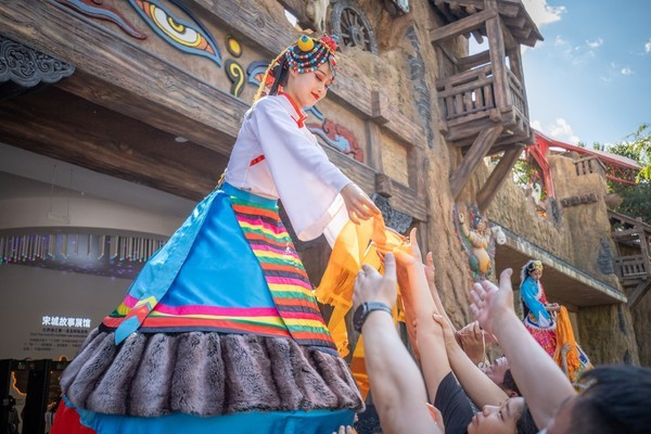这些宋城演艺的姑娘小伙们穿着旧时的华服,通过专业的表演展现了封建时期少数民族贵族嫁女招婿的精彩过程!这种表演让游客在娱乐放松的同时,还了解了一些关于藏羌民族的历史文化。
