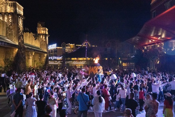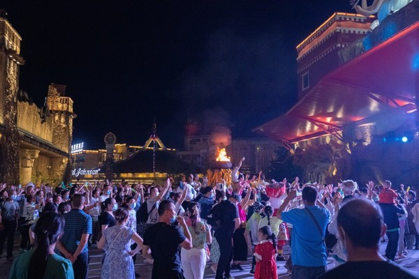 所有人都围在篝火旁,在现场气氛调度工作人员的引导下,一起舞动、摇摆。