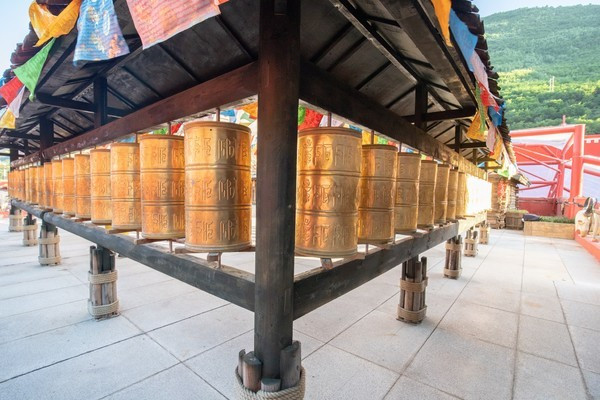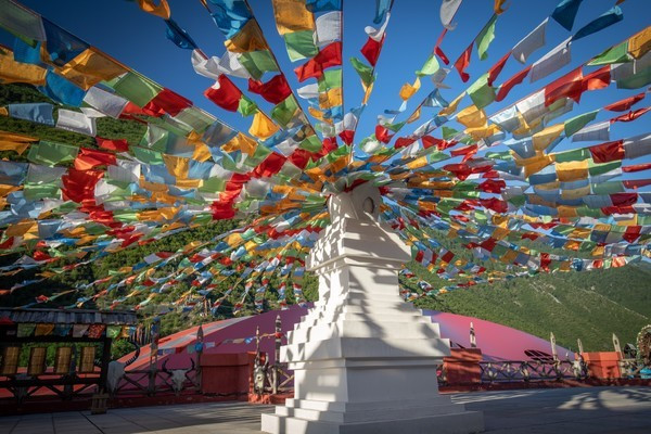 景区内特色的经幡、白塔与转经筒。