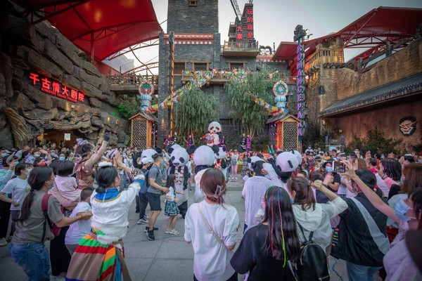 “大熊猫们”卖力地旋转跳跃,笨笨拙拙的样子看上去憨态可掬极了,萌翻了众人,大家都争着合影拍照。不过天气挺热,有点心疼这些穿着熊猫服的工作人员们,大家都非常敬业可爱。